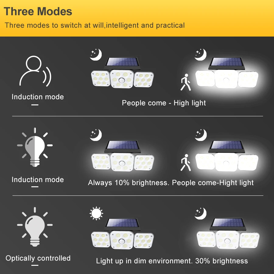 1. Этот солнечный светильник 188 автоматически включается ночью или в темных местах (тусклый светильник) и выключается днем или в светлых местах.2. Этот 188 солнечный светильник автоматически включит тусклый светильник ночью. Он включит яркий светильник в течение примерно 20 секунд, когда люди приближаются примерно на 3-5 метров, а затем возвращаются в тусклый светильник.3. Ночью, он автоматически включится, когда почувствует движение человека. Когда люди выйдут из диапазона чувствительности, он задержится около 20 секунд, а затем выключится.