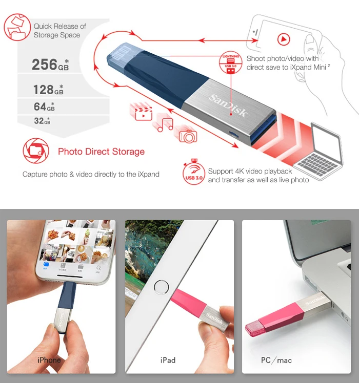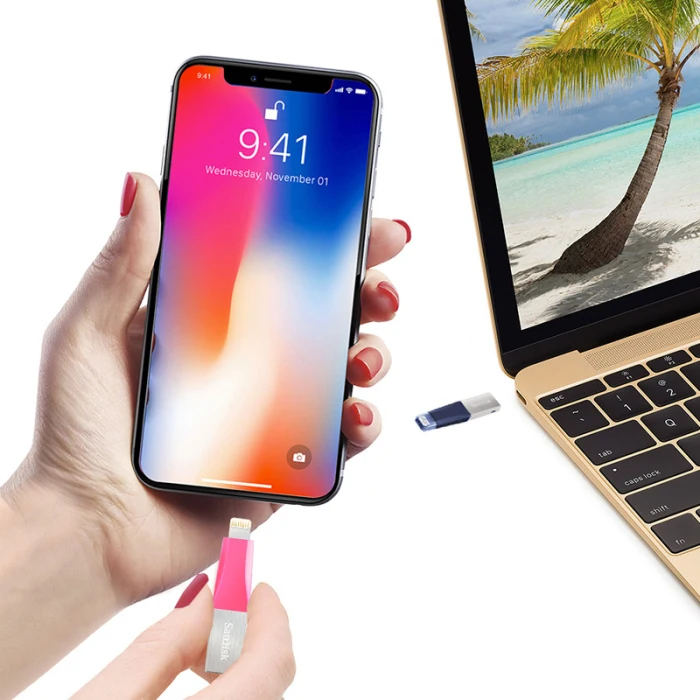 Освободите место на вашем iPhone или iPad быстро и легко с помощью мини-флеш-накопителя iXpand * 1. Подключите разъем Lightning, и вы можете легко перемещать фотографии, видео и другие файлы с вашего устройства и на диск. Там вы можете переносить файлы на ПК или компьютер Mac или хранить их на диске. Вы также можете сохранить непосредственно на диск при использовании приложения для съемки фотографий и видео.