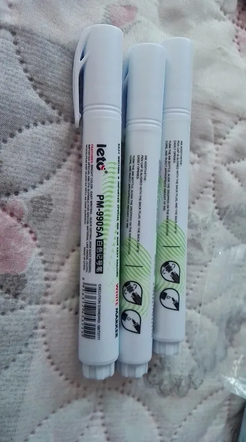 Пришёл довольно быстро (вместе с другими посылками). И пишет и выглядит потом как белый спиртовой маркер (то есть не такой густой, как ручки белые, имеет прозрачность при нанесении).