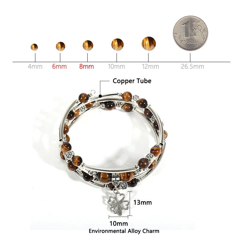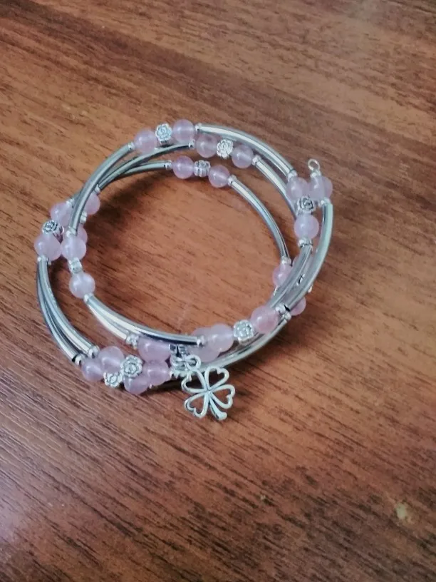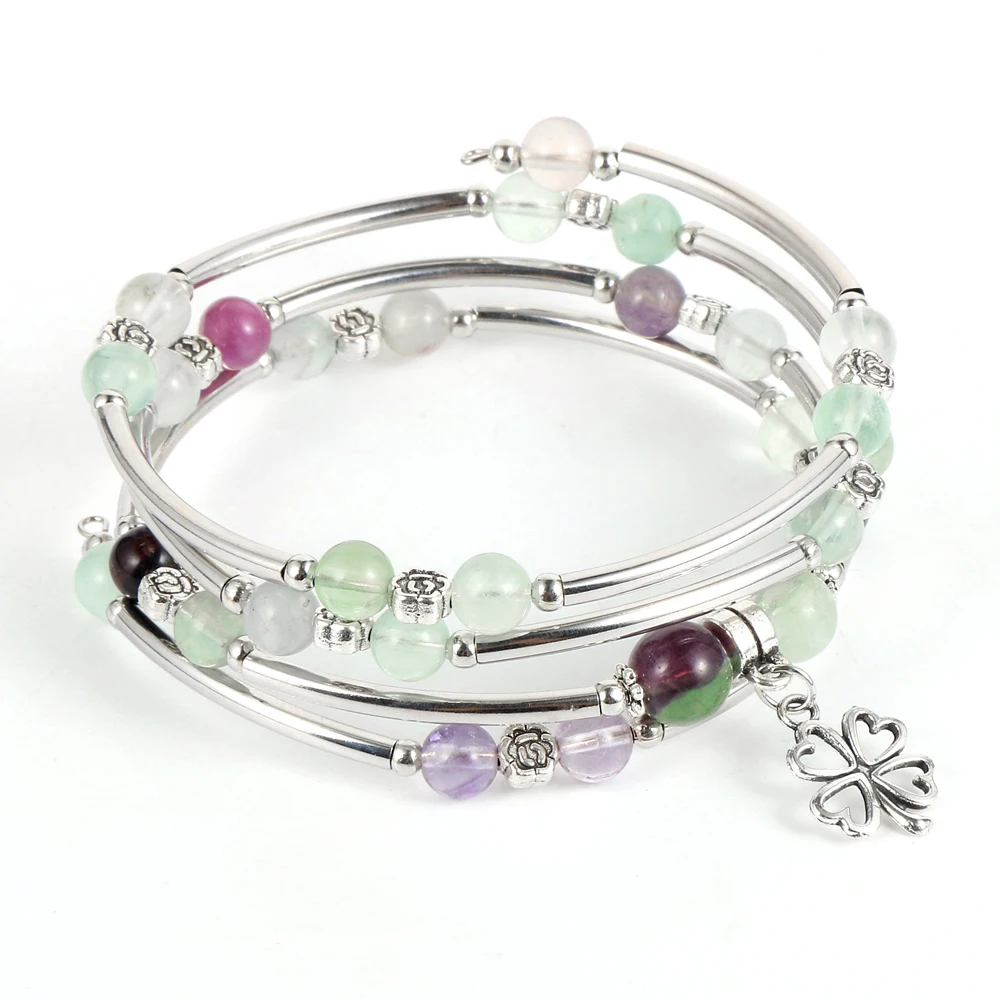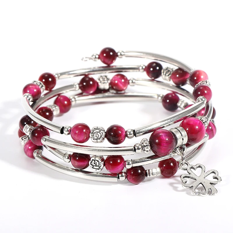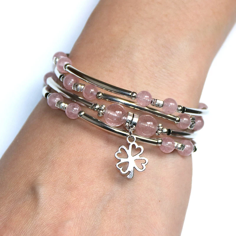 Браслет женский из натурального камня, многослойный, с медной трубкой, розовый, кварцевый, фиолетовый, с кристаллами, с бусинами
