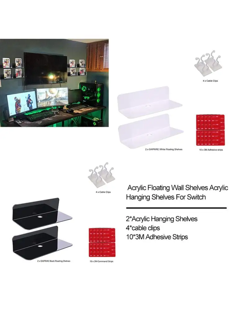 2-пакеты плавающие полки настенный набор из 2-легко расширить настенное пространство-акриловые подвесные полки для спальни, игровой комнаты, гостиной, ванной комнаты, офиса с кабельными зажимами2 упаковки акриловые, плавающие полки для стен, свободное от повреждений расширение пространства для стен, небольшая полка для переключателя/смарт-Динамик/фигурки с зажимами для кабелей1. Универсальность: множество комбинаций для увеличения пространства различных сцен, легкое и неповрежденное размещение переключателей, умных динамиков, фигурок и других элементов. (Размер: 23*9*6 см/9*3,5*2,4 дюйма)2 、 профессиональное качественное исполнение: плавающие полки сделаны из высокого качества обучения нанесению акрила, используя один и тот же клейкую ленту 3м как GoPro, вмещает до 8 фунтов очень надежно.3. Простая установка: установка проста, без повреждений и отверстий в стенах, каждая маленькая полка имеет 2 зажима кабеля и 5*3 м клейкие ленты.4. Минималистский стиль: настенные полки имеют красивый внешний вид и дополняют ваши украшения, дизайн отверстий и кабельные зажимы образуют систему подвески, чтобы сделать поверхность более красивой и выразительной.5. Различные комбинированные Способы установки для различного расширения пространства, трансформирует впустую часть пространства на стене в просторную зону хранения, помогает сохранить все аккуратно организованное в пределах руки.Параметры продукта:1. Название продукта: акриловые подвесные полки2. Материал: акрил3. Размер: 23*9*6 см/9*3,5*2,4 дюйма4. Цвет: черный/белый5. Варианты применения: для спальни, игровой комнаты, гостиной, ванной комнаты, офиса и т. д.Упаковочный лист:2 * Акриловые подвесные полки4 * кабельные зажимы10*3 м клейкие ленты