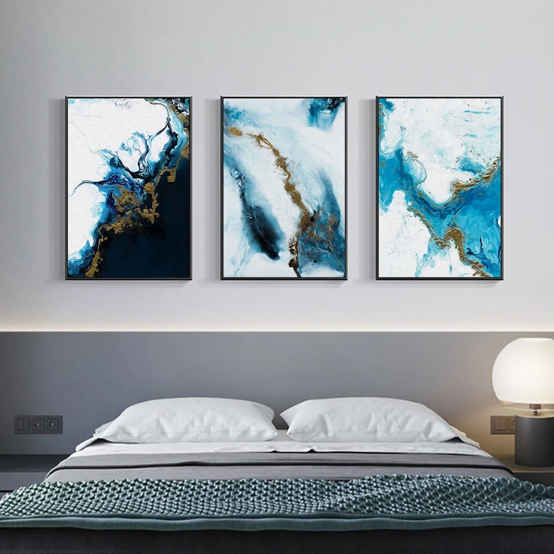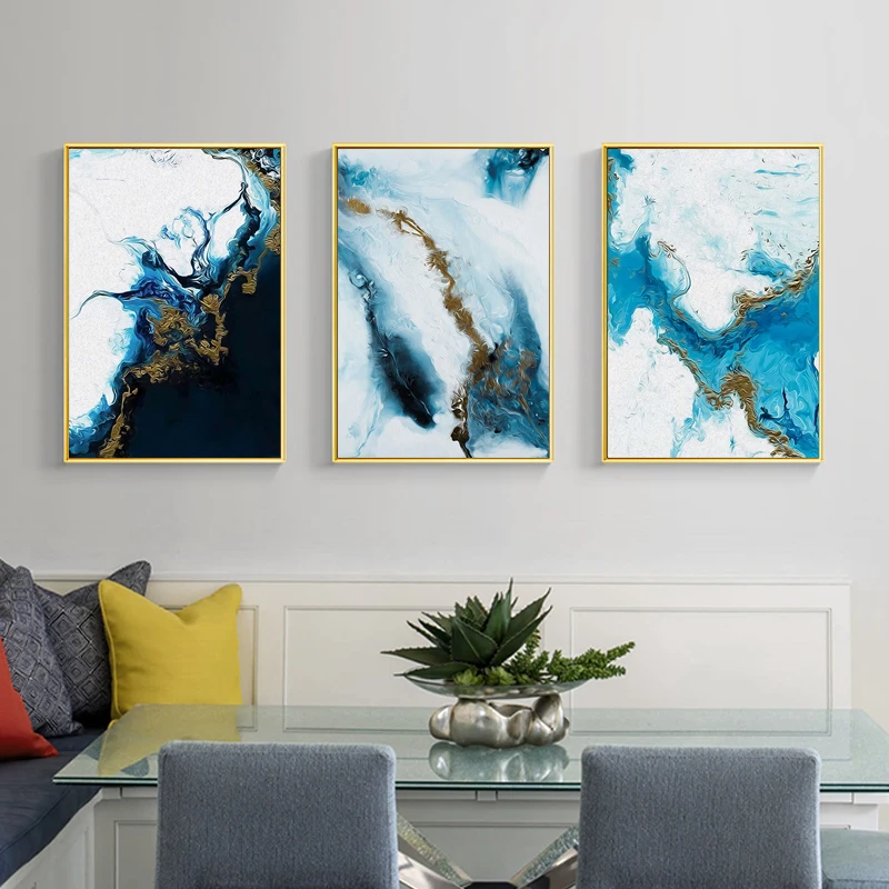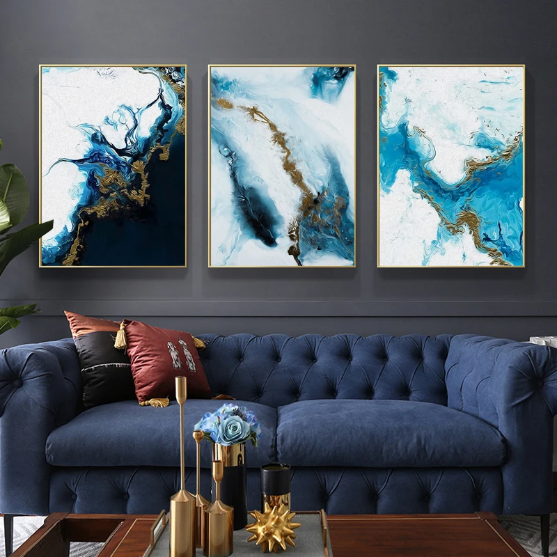 Скандинавская Абстрактная Картина на холсте синего и золотого цвета, Постер и печать, уникальный декор, настенные картины для гостиной и спальни
