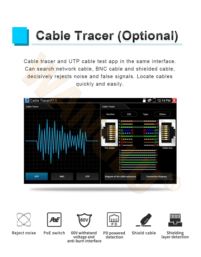 Поиск кабеля BNC, сетевого кабеля и телефонного кабеля из беспорядочных кабелей. Поиск кабеля и кабель UTP можно проверить одновременно * для IPC5000C Plus