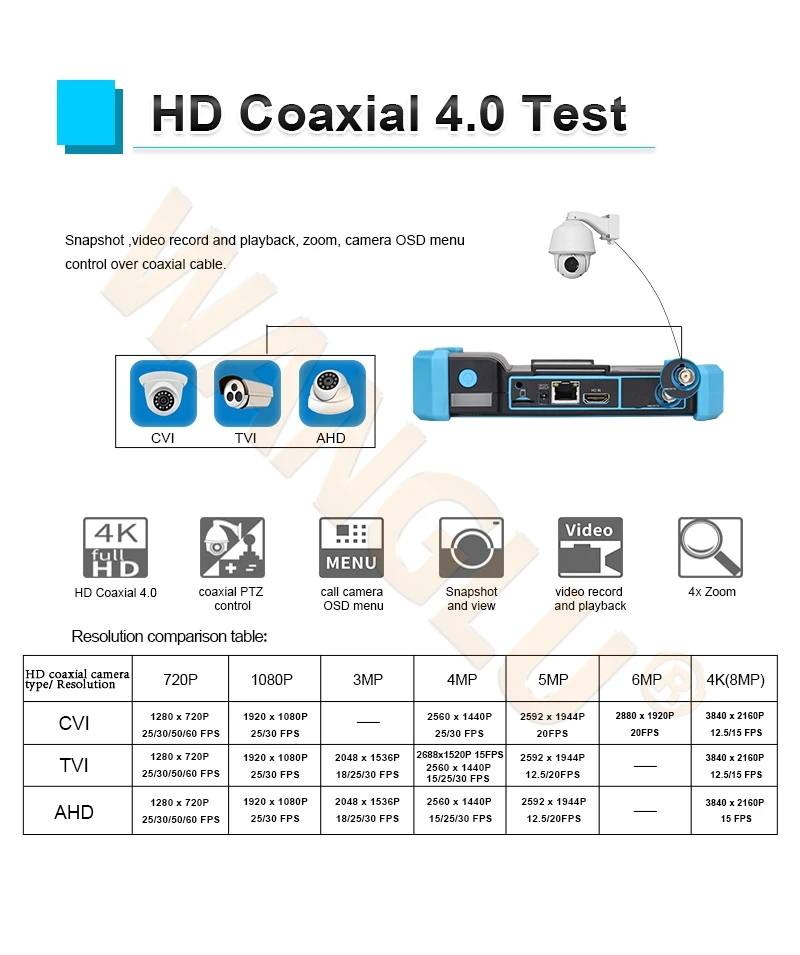 ● 8MP TVI тест, 3840x2160P 12,5/15 кадров в секунду, 4xzoom, видео запись и воспроизведение, коаксиальный PTZ управление и вызова меню OSD