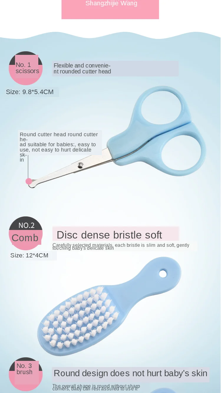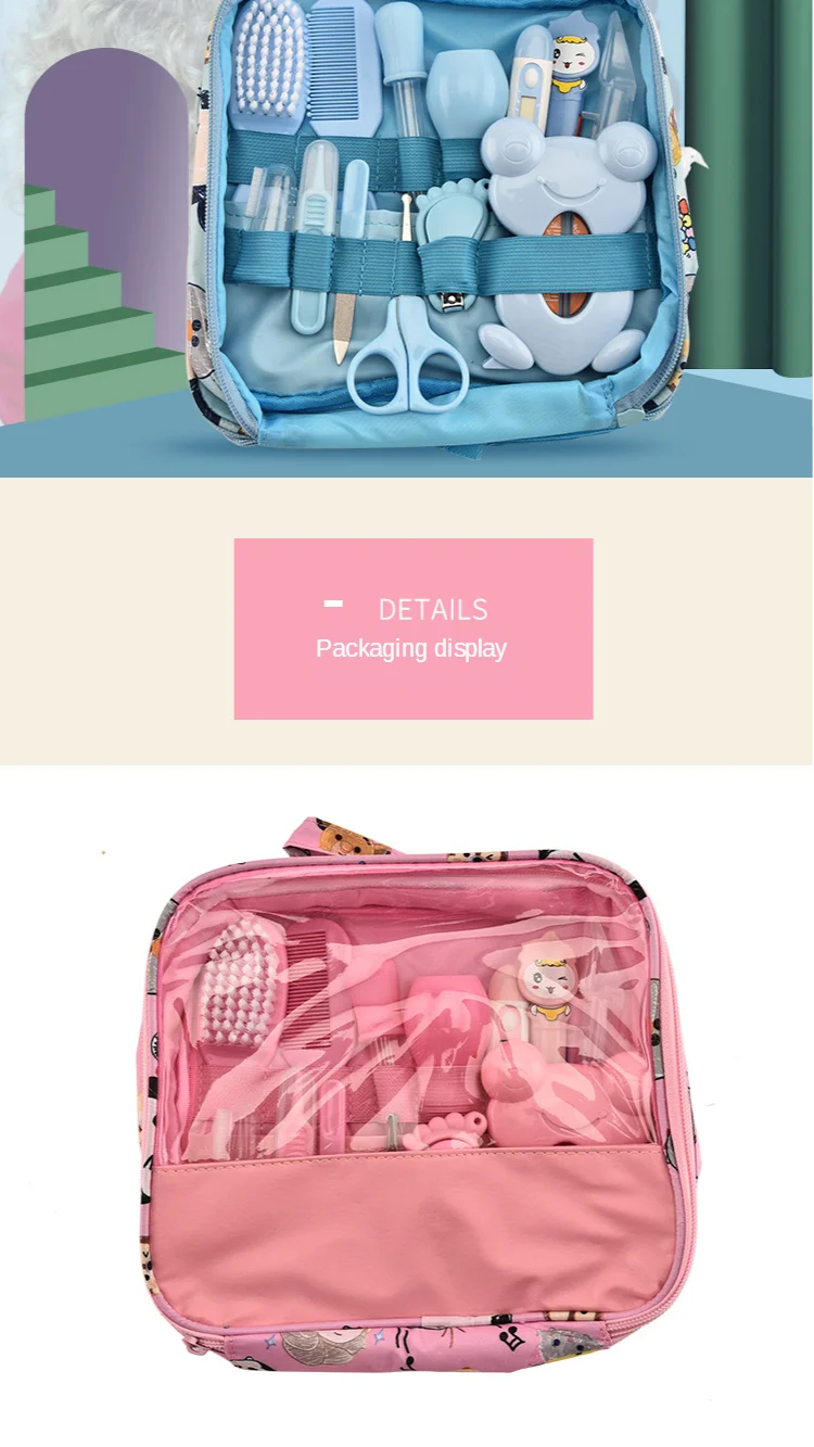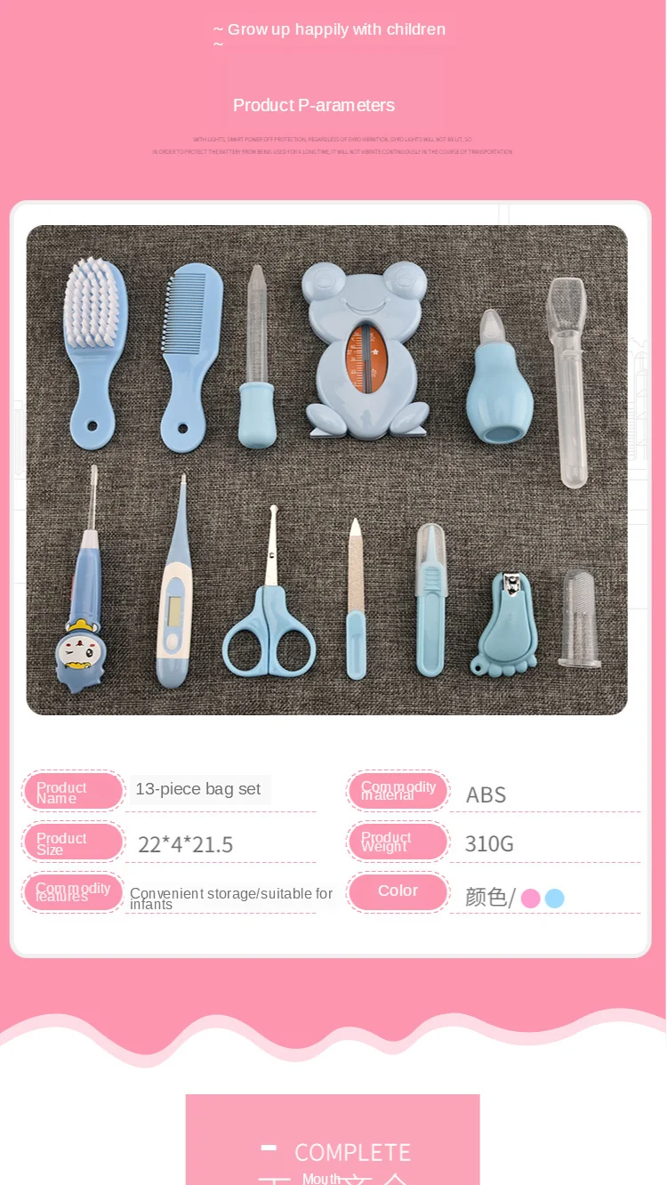Посылка включает в себя: безопасные ножницы, щетка для волос, расческа и кусачки для ногтей, термометр для тела и т. д. Характеристики: Состояние на 100% абсолютно новый Материал: пластик, металл Цвет: розовый, синий, розовый светильник (на выбор)