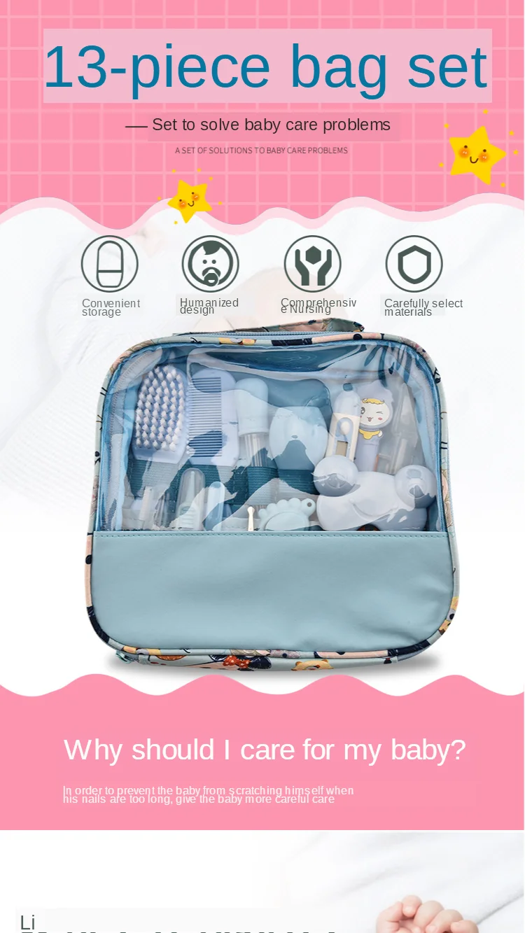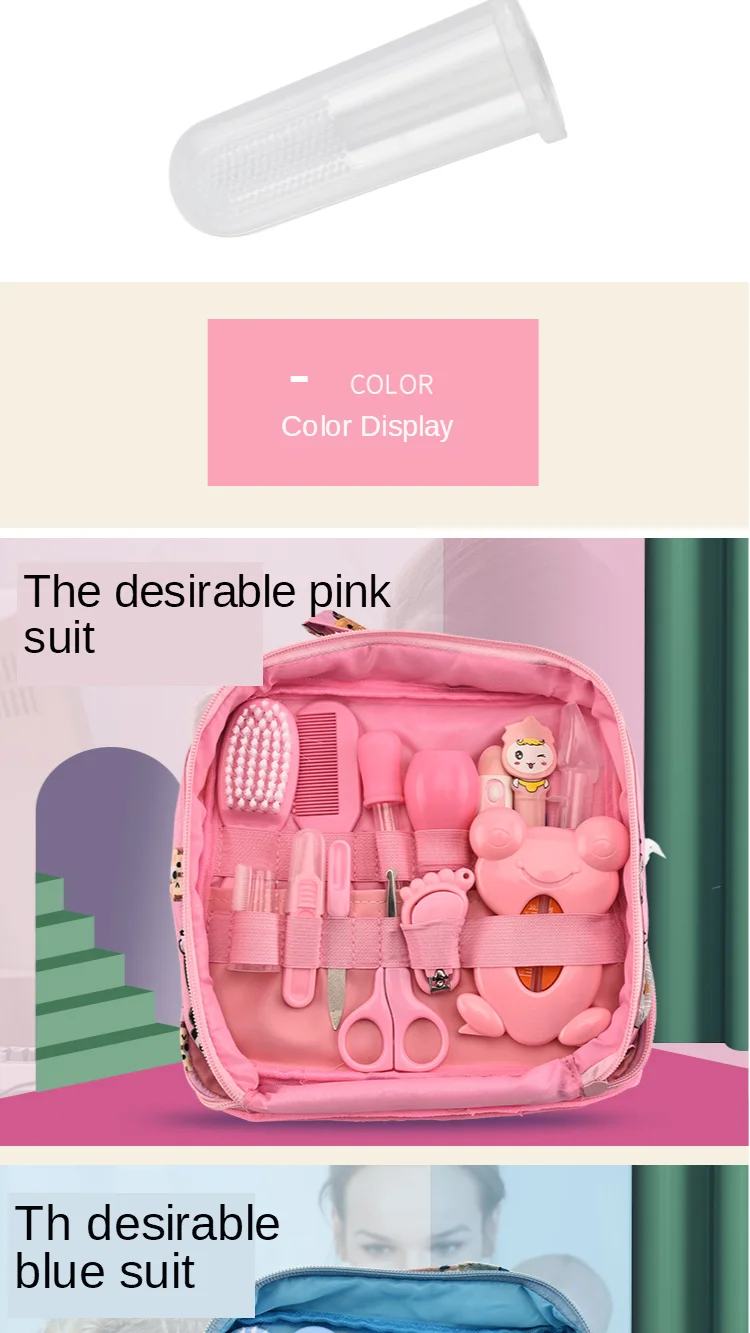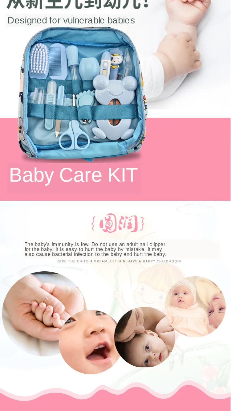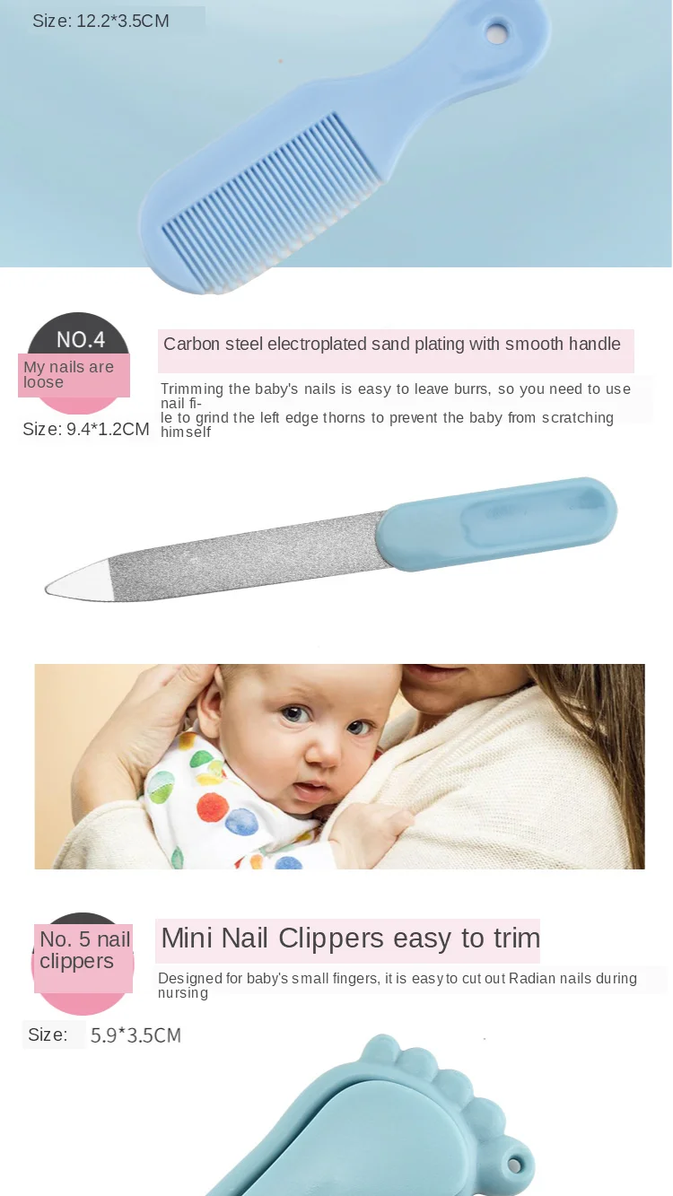 Посылка включает в себя: безопасные ножницы, щетка для волос, расческа и кусачки для ногтей, термометр для тела и т. д. Характеристики: Состояние на 100% абсолютно новый Материал: пластик, металл Цвет: розовый, синий, розовый светильник (на выбор)