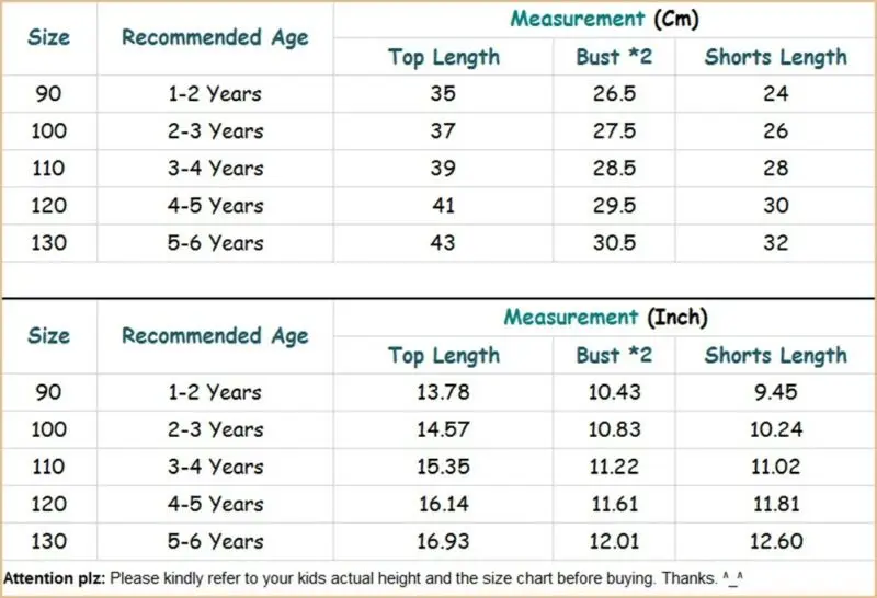 Размер Рекомендуемый возраст Измерение (см) Длина верха Бюст * 2 Длина шорт 90 1-2 года 35 26,5 24 100 От 2 до 3 лет 37 27,5 26 110 От 3 до 4 лет 39 28,5 28 120 От 4 до 5 лет 41 29,5 30 130 От 5 до 6 лет 43 30,5 32 Размер Рекомендуемый возраст Измерение (дюйм) Длина верха Бюст * 2 Длина шорт 90 1-2 года 13,78 10,43 9,45 100 От 2 до 3 лет 14,57 10,83 10,24 110 От 3 до 4 лет 15,35 11,22 11,02 120 От 4 до 5 лет 16,14 11,61 11,81 130 От 5 до 6 лет 16,93 12,01 12,60Разница в 2-3% в соответствии с измерениями вручную. Прежде чем купить эту товарную позицию, просим тщательно свериться с таблицей размеров. 1 дюйм = 2,54 см Обратите внимание что небольшая разница в цвете считается приемлемой. Это может быть связано с положением источника света и с настройками экрана.