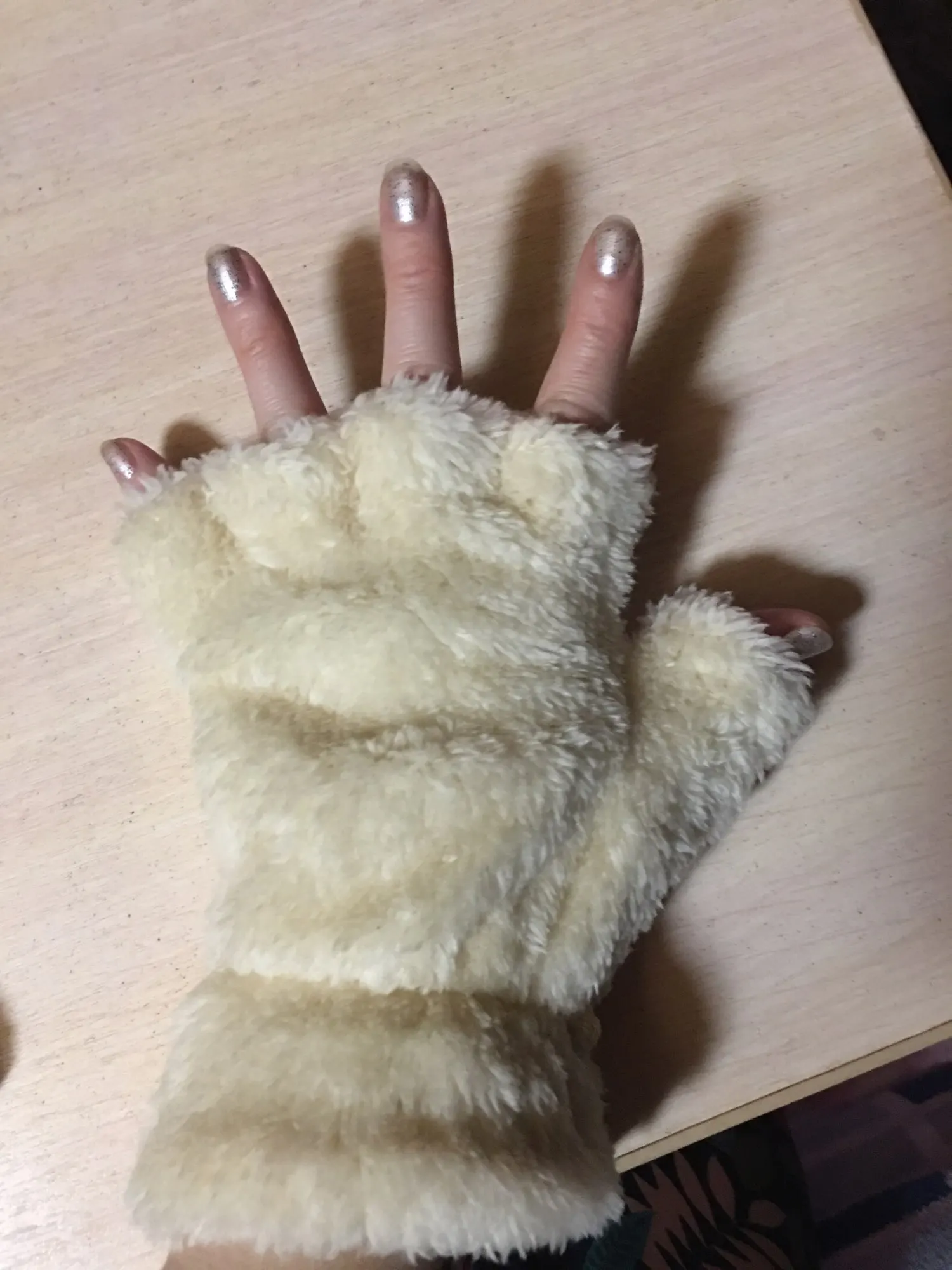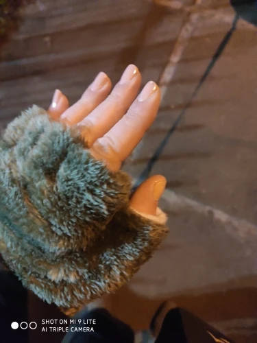 Перчатки очень хорошего качества, очень пушистые, однако, но ваши пальцы, кажется, очень холодно, очень быстро, потому что они являются единственными частями, не покрытыми, в то время как остальная часть ваших рук держится в тепле перчатками. Они действительно красивые, однако! Я рекомендую их :)