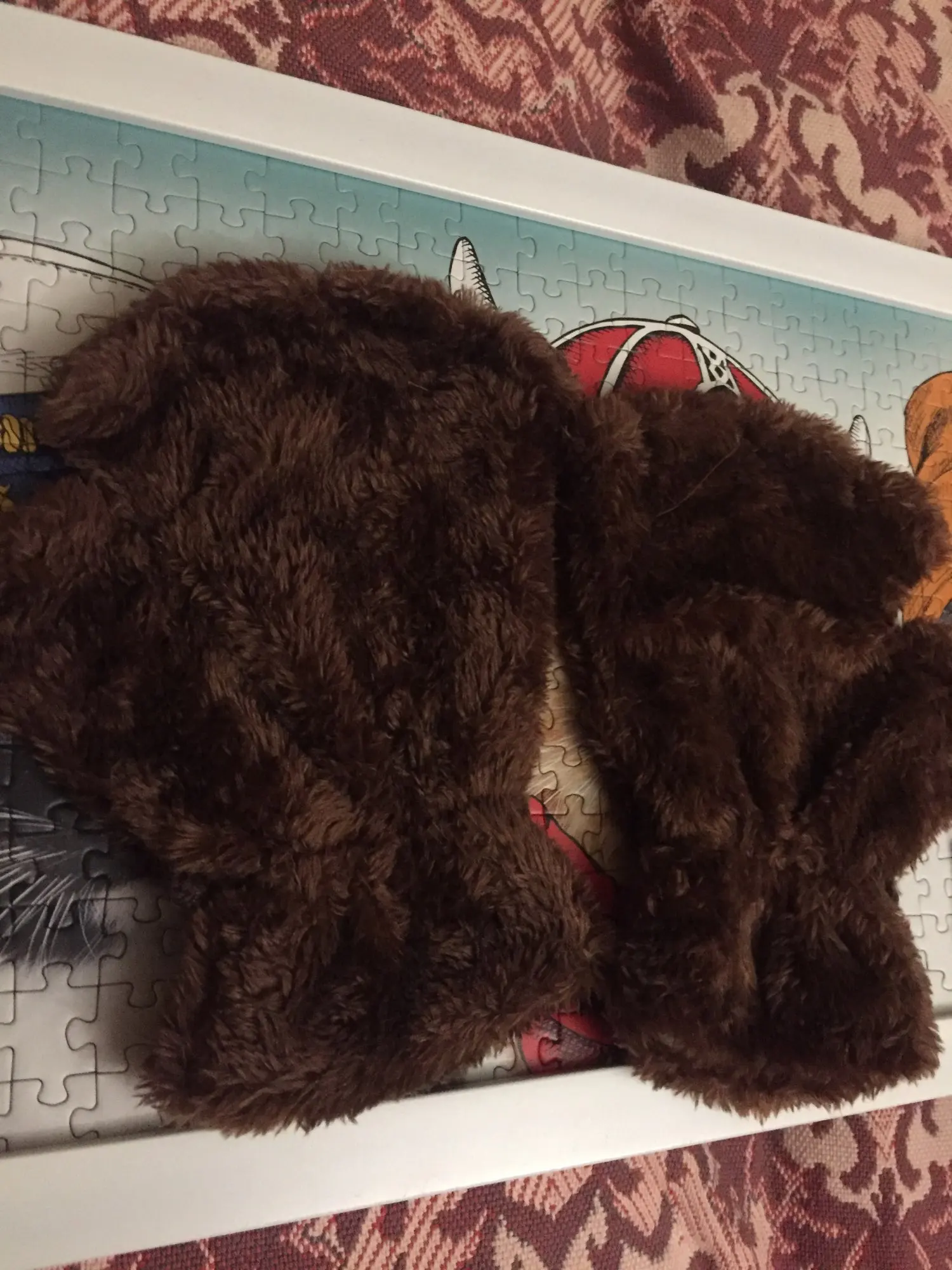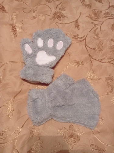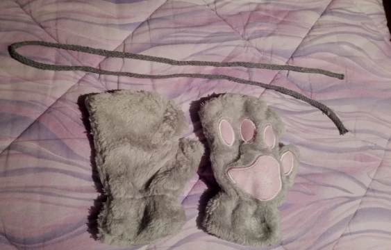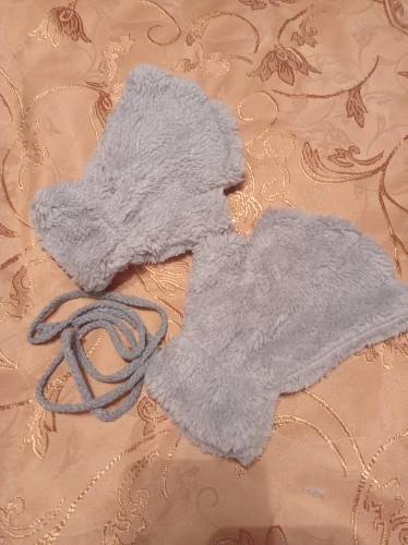 Доставка почти месяц. Ну мех конечно у них не такой прикольный как на фото, но по отзывам я это понимал. Внутри белая тряпка. Кое где торчали нитки. Сразу отрезал. Ну и в комплекте идёт веревочка к ним. На рукавичках есть петельки. Заключение - за 200 рублей - милая хрень на подарок) можно брать)