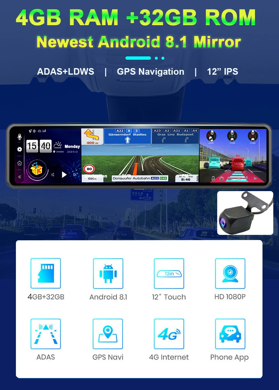 Зеркало заднего вида Автомобильный, видеорегистратор 12 дюймов с Wi-Fi, 4G, Android 8,1, GPS, ADAS