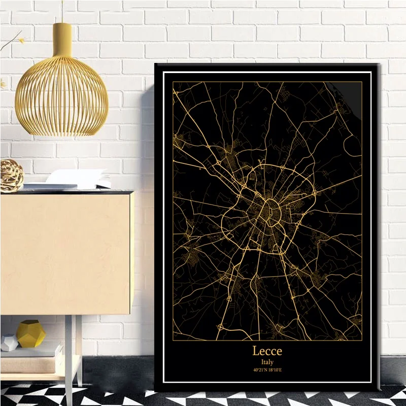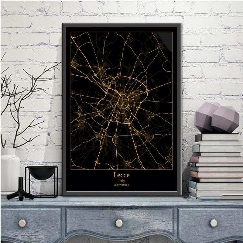 Лечче Италия черный и золотой город светильник Карты изготовленный на заказ карта городов мира Плакаты Печать на холсте Nordic Стиль Wall Art домашний декор