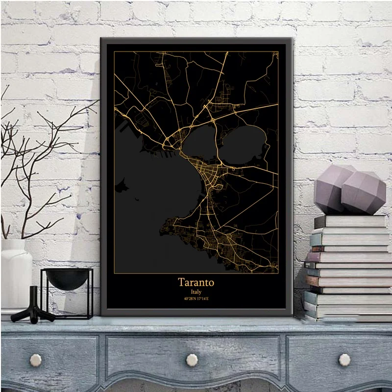Таранто италия черный и золотой город светильник Карты изготовленный на заказ карта городов мира Плакаты Печать на холсте Nordic Стиль Wall Art домашний декор