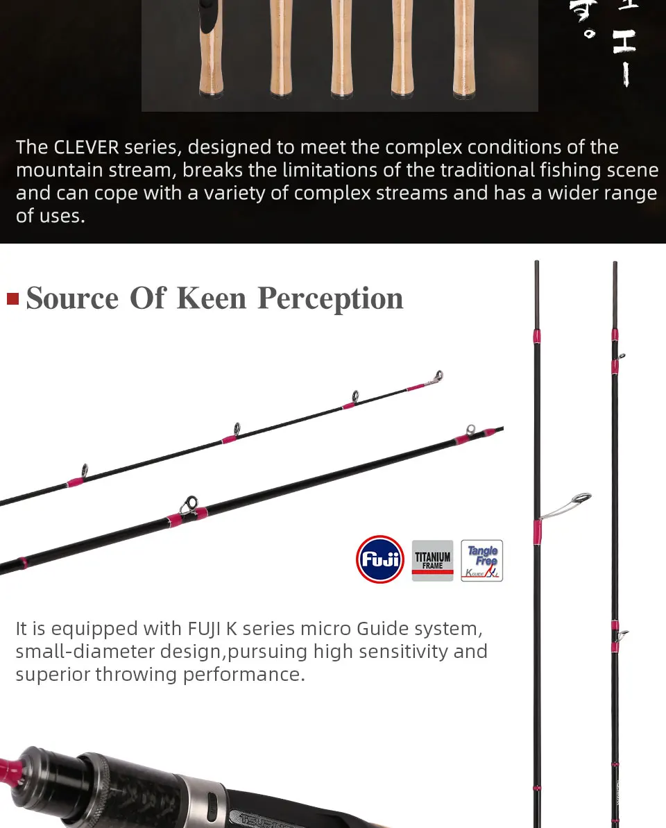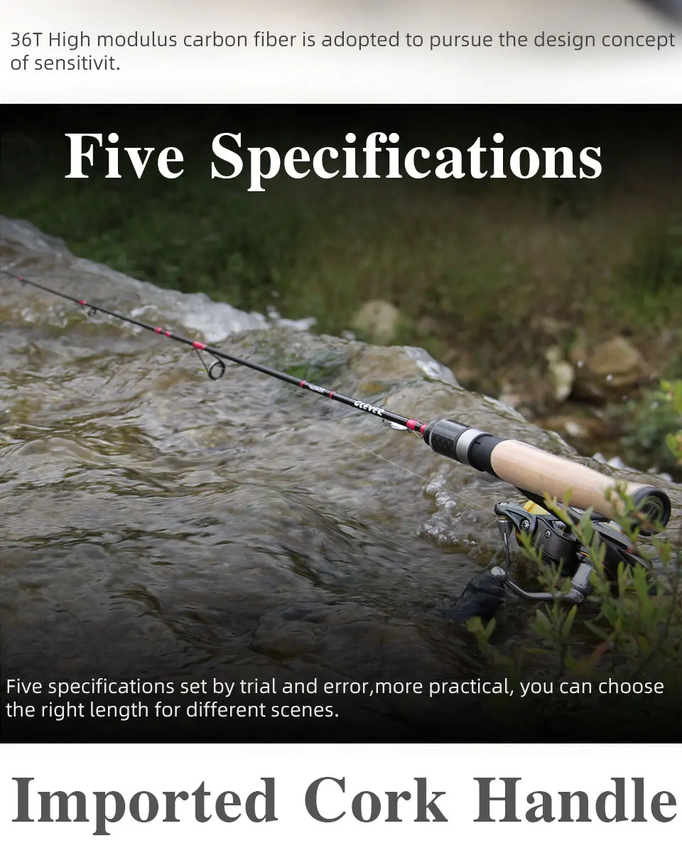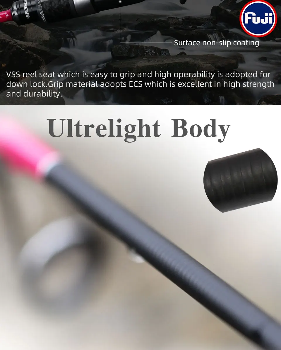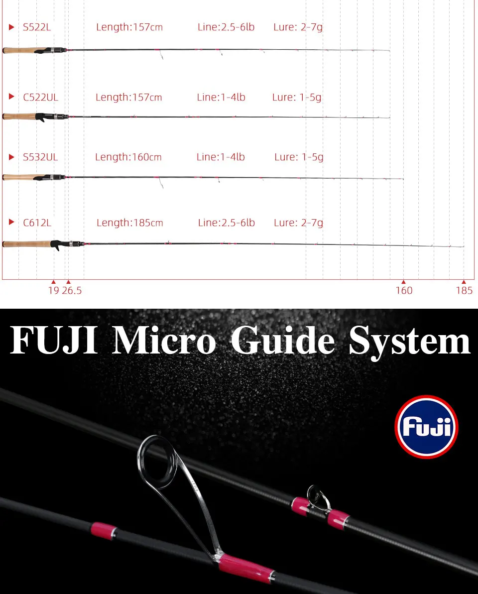 1,36 T высокий модуль углерода en ofrece sensibilidady rendimiento2. Микро-направляющая система FUJI K серии, дизайн малого диаметра, высокая чувствительность и превосходное представление бросания.3. Сиденье Катушки FUJI, позволит вам чувствовать себя комфортно, увеличивая точность и стабильность литья.4. Микро-направляющая система FUJI и легкий альконит5. Пробковая ручка, эргономичный дизайн, больше подходит для ладони, удобная ручка, эффективно уменьшает усталость рыбалки