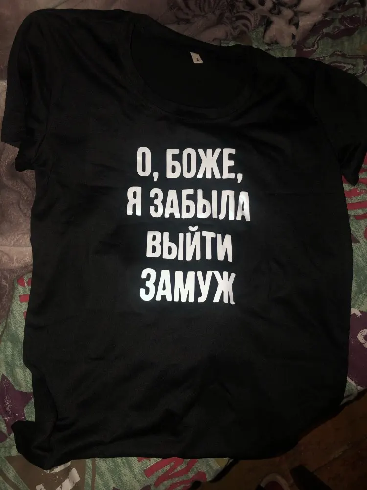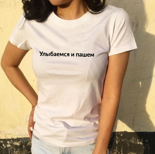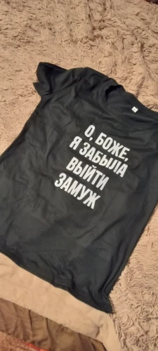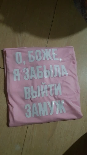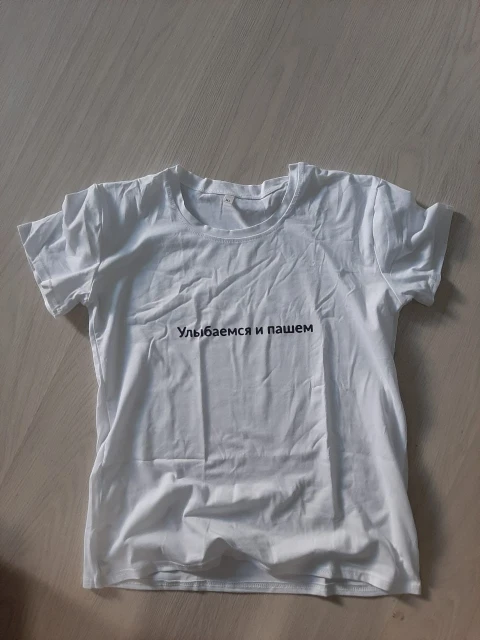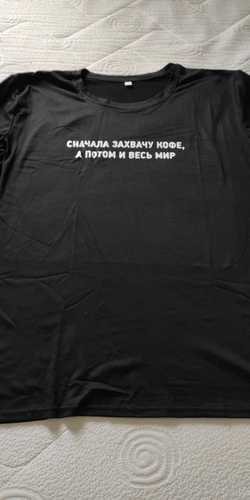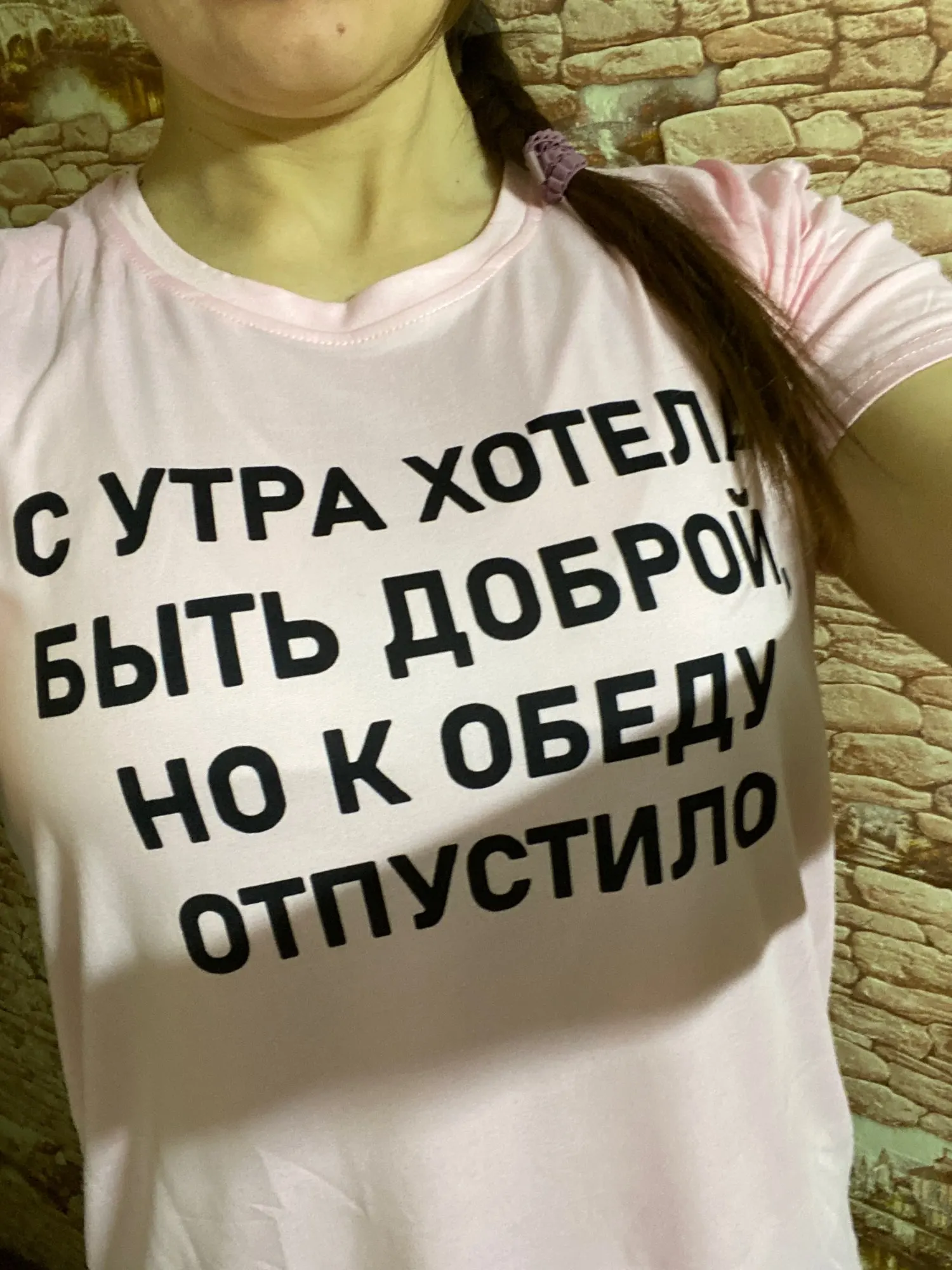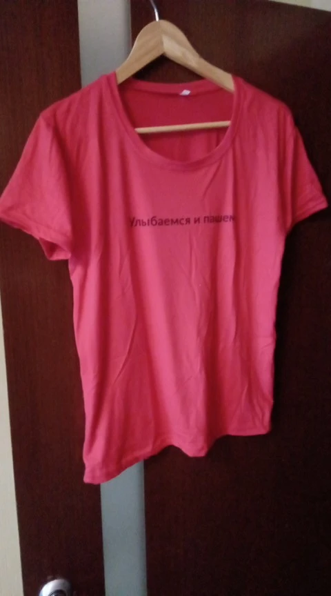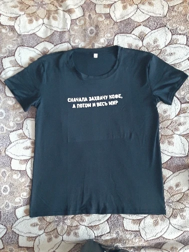 Футболку брала размер М то есть - она фактически маломер, свой размер 42-44 ношу, села вплотную, тянется хорошо. Хотелось бы посвободнее чуток, буквы напечатаны хорошо, но со временем стеруться. В целом не плохо, доставка составила всего 14 дней до Свердловской области с отслеживанием.