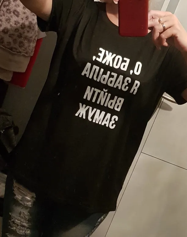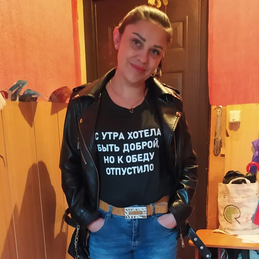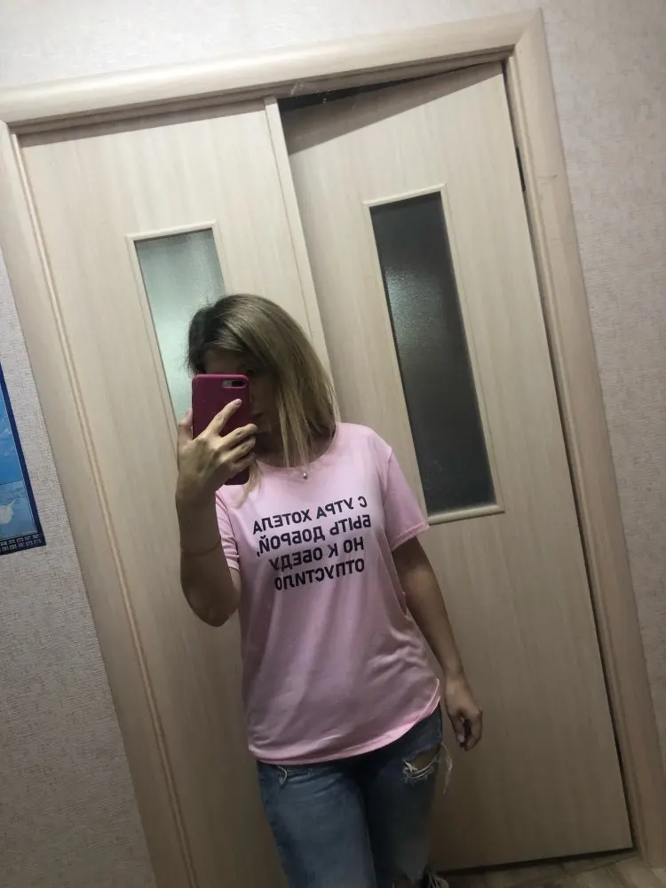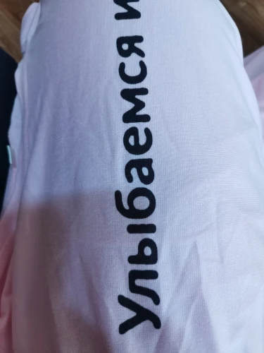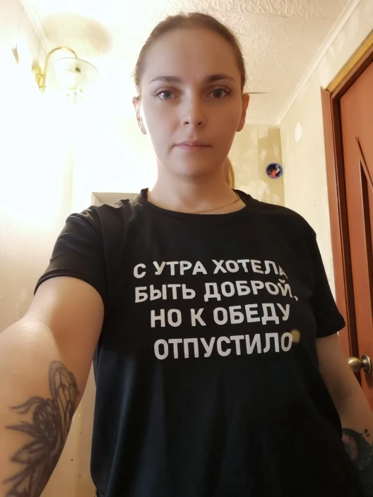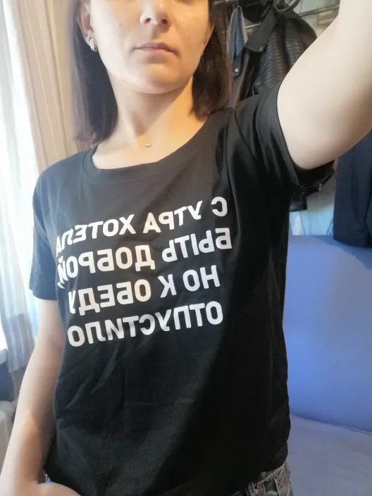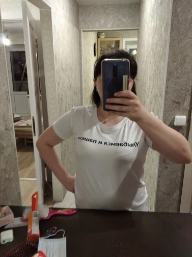 Футболку брала размер М то есть - она фактически маломер, свой размер 42-44 ношу, села вплотную, тянется хорошо. Хотелось бы посвободнее чуток, буквы напечатаны хорошо, но со временем стеруться. В целом не плохо, доставка составила всего 14 дней до Свердловской области с отслеживанием.