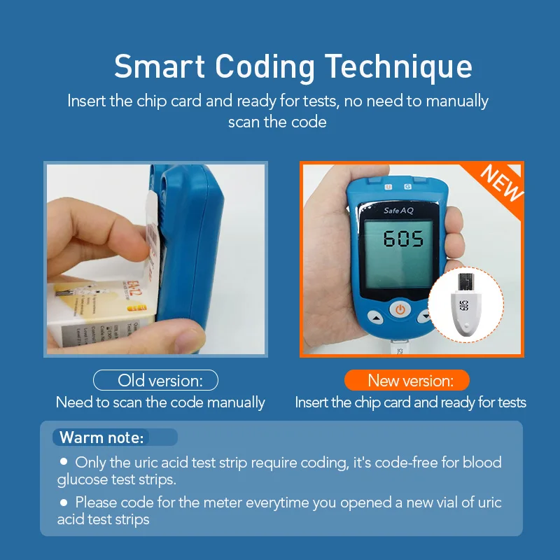 1. Что означает «Е-4» на дисплее?Ответ: ошибка кодирования. Пожалуйста, обратитесь к руководству пользователя 2. Как установить корректирующий код мочевой кислоты (Используйте кодовый чип)?Ответ: кодовый чип, соответствующий тест-полоскам, должен использоваться при использовании нового флакона тест-полоски мочевой кислоты. Найдите чип кода в тестовой полосе посылка, проверьте, соответствует ли номер кода на чипе кода кодовому номеру на тестовой полосе посылка. Если нет, вы получите неточные результаты тестирования. Если в Safe AQ UG meter уже есть чип кода, пожалуйста, выньте его и вставьте новый чип кода. Вставьте чип кода в порт чипа кода, счетчик сделает короткий звуковой сигнал и осуществит самопроверку. Счетчик будет отображать номер кода и счетчик будет выключен после короткого звукового сигнала.Если есть ошибка, счетчик будет отображать E-4, пожалуйста, вытащите чип кода и вставьте снова, если все еще не удалось, пожалуйста, свяжитесь с нашей службой поддержки клиентов.Каждый чип кода должен быть вставлен только один раз, счетчик сохранит номер кода, пока не вставит новый чип кода.
