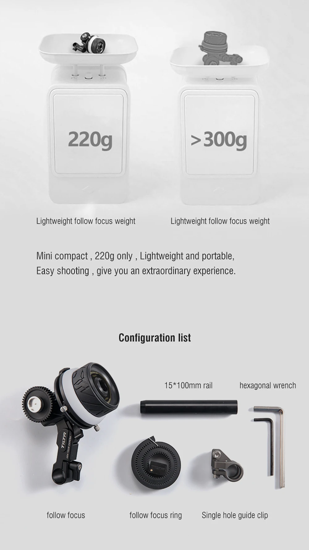 Фокусировка Mini Follow сделана как единое устройство с возможностью регулировки крепления одного стержня для любого размера объектива cine или фотообъектива. Одно Крепление стержня крепится к любому стандартному рельсу 15 мм.