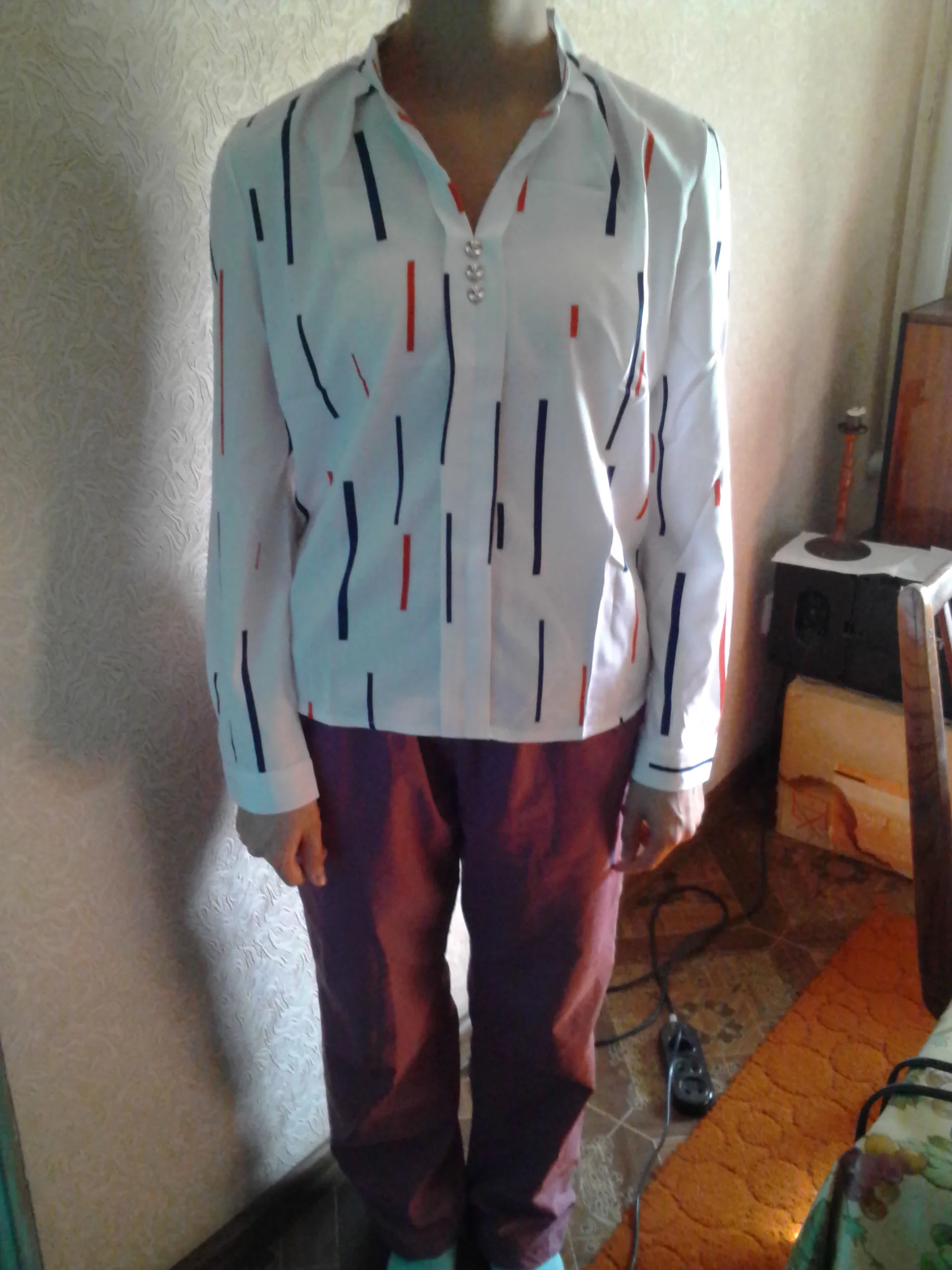Блузка понравилась, ткань синтетическая, но приятная к телу. По размеру подошла, единственное в плечах лишний 1см, но не критично, в глаза не бросается))