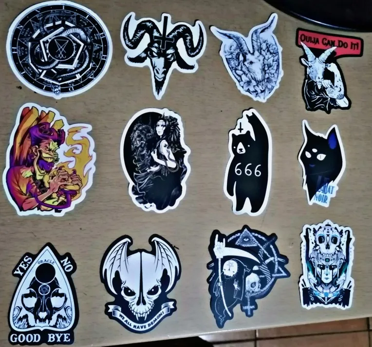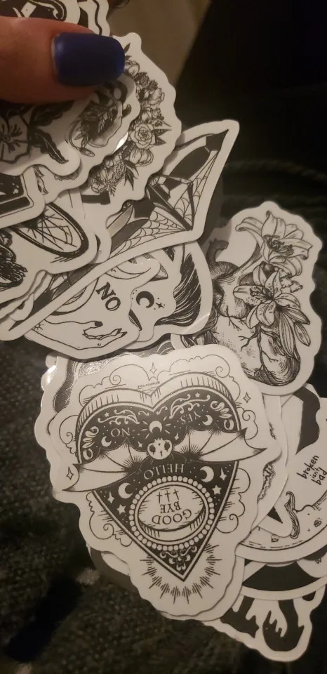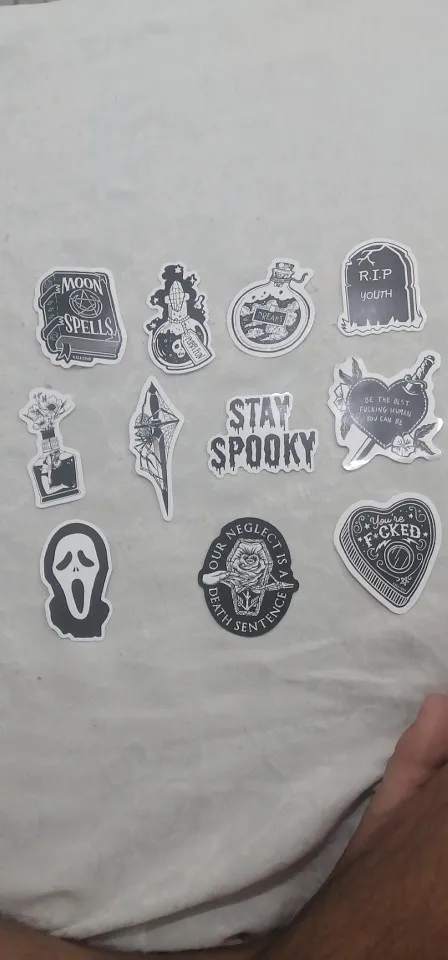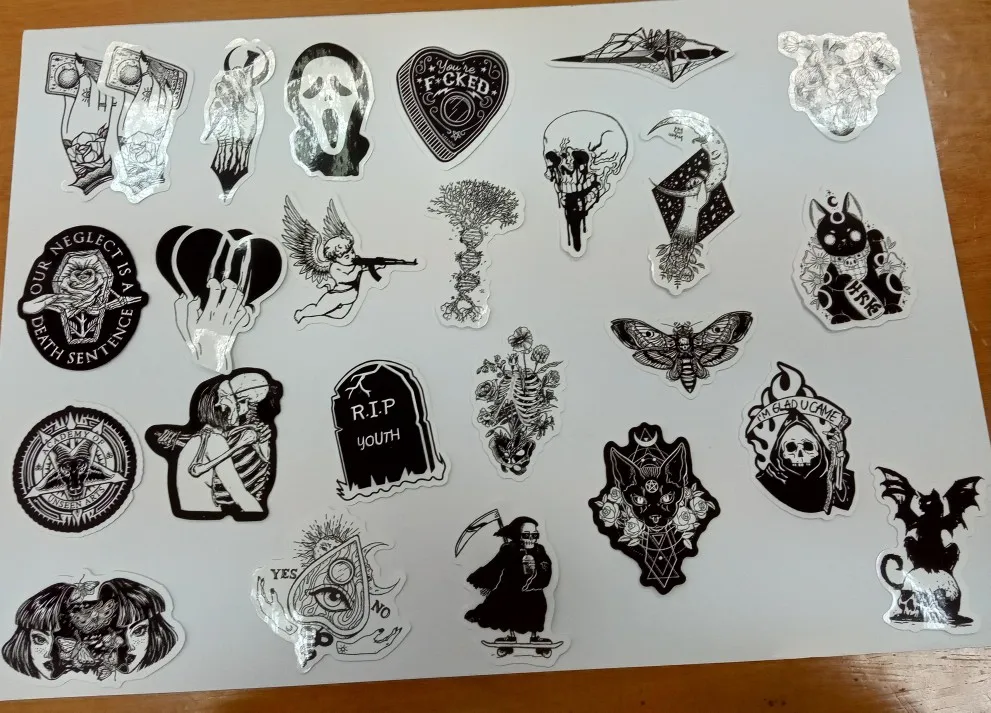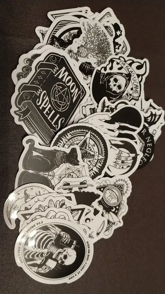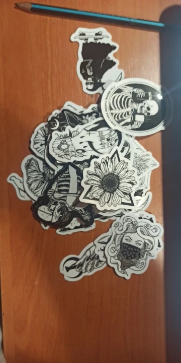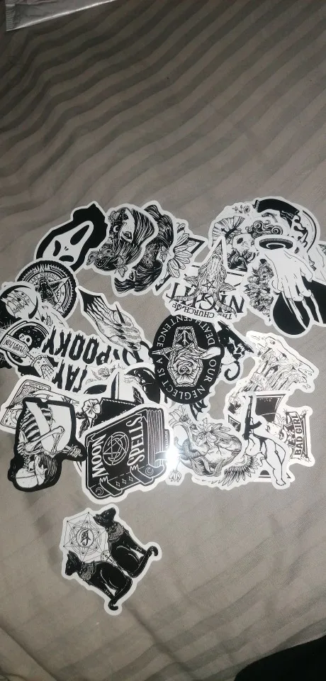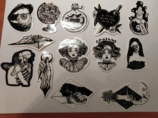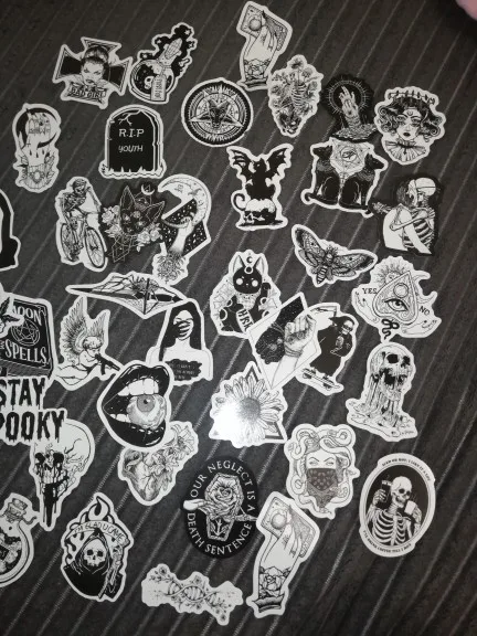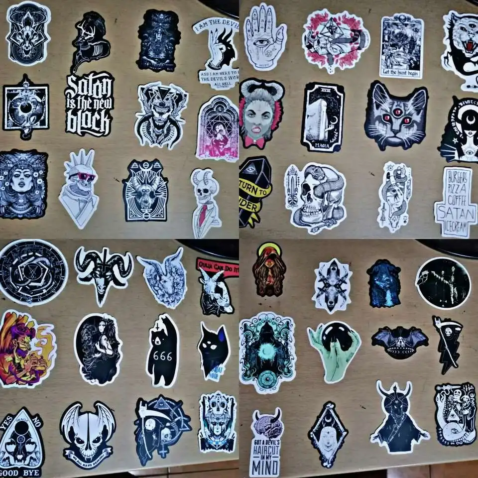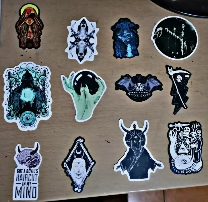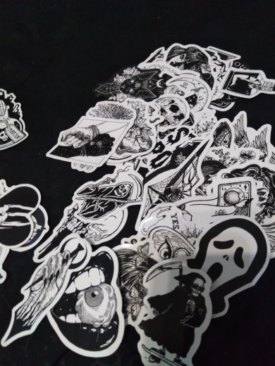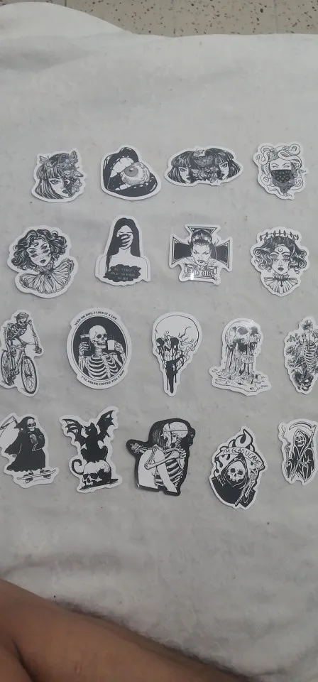 Отличная печать, мягкая и глянцевая бумага высокого качества, 50 штук идеально подходят для тех, кто любит готику, вы можете украсить все, что хотите, так как они прилипают Ну и не осыпайтесь, есть черепа, тип wicca, альтернативных фильмов ужасов и иллюстраций, мне очень понравилось, это заняло меньше месяца, чтобы добраться в Мексику