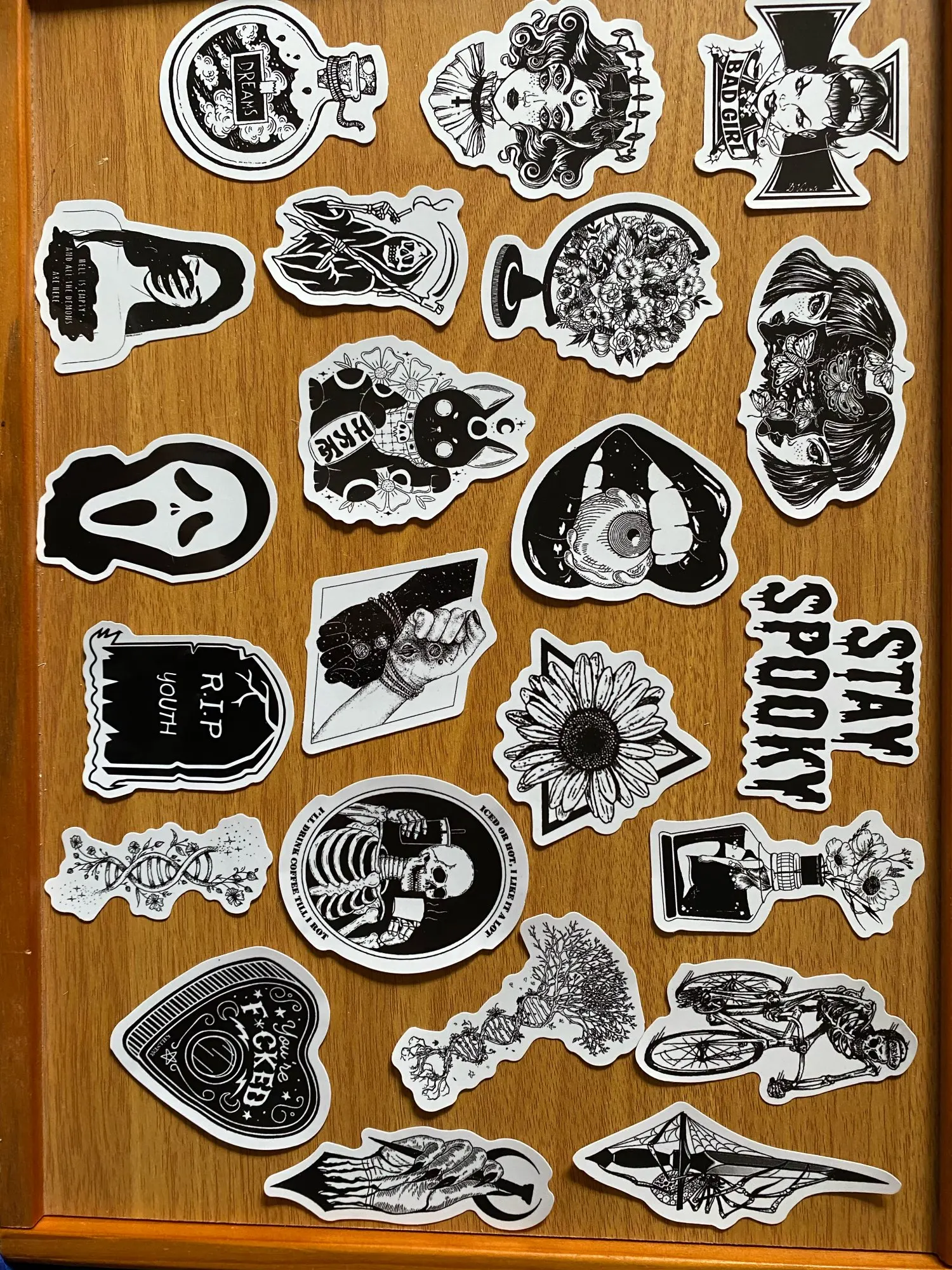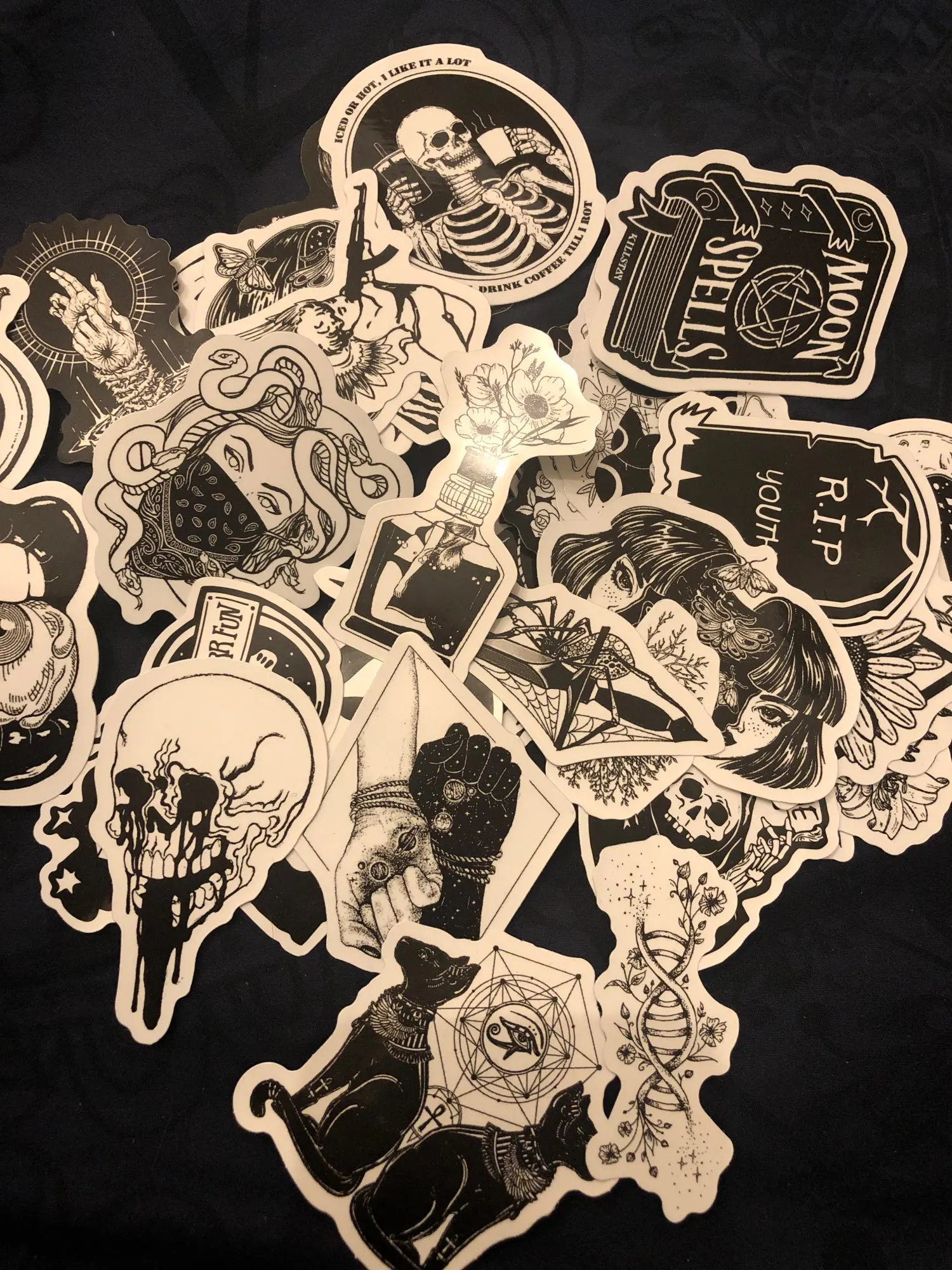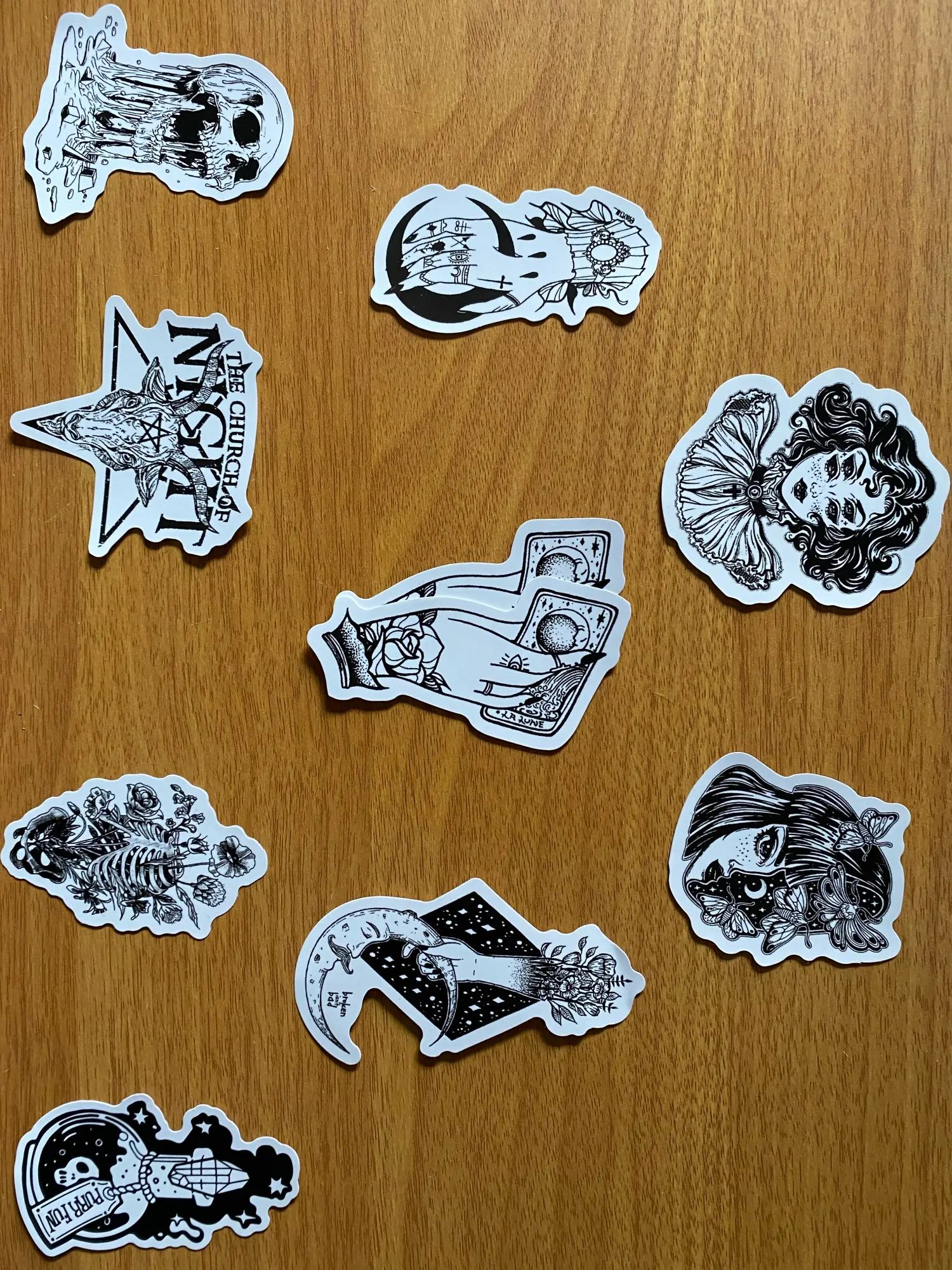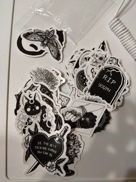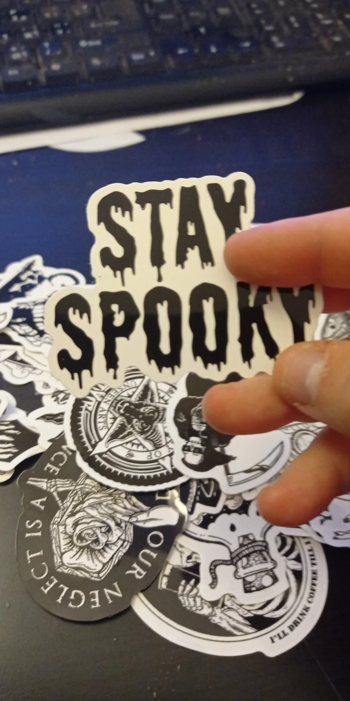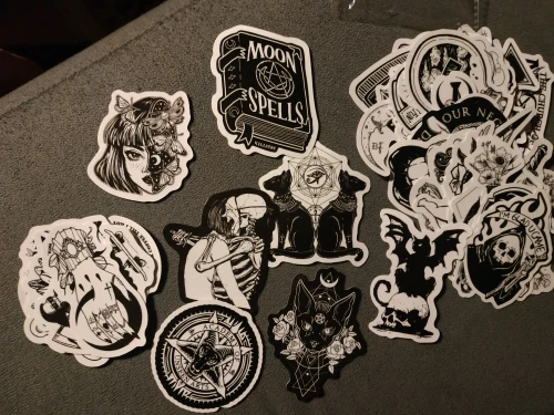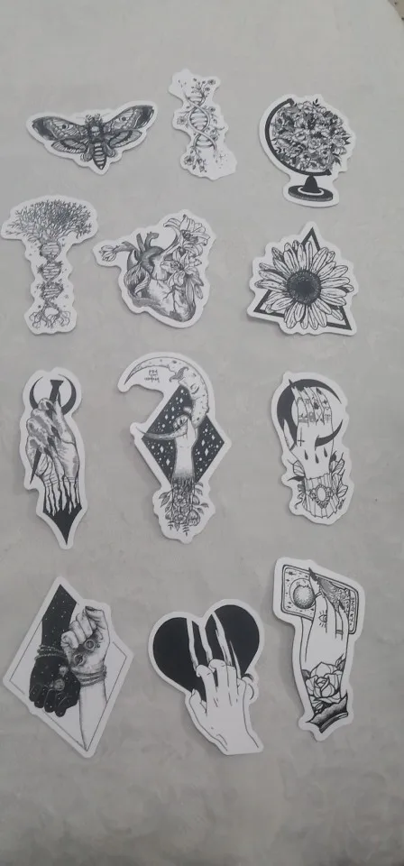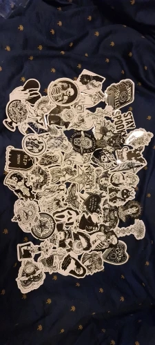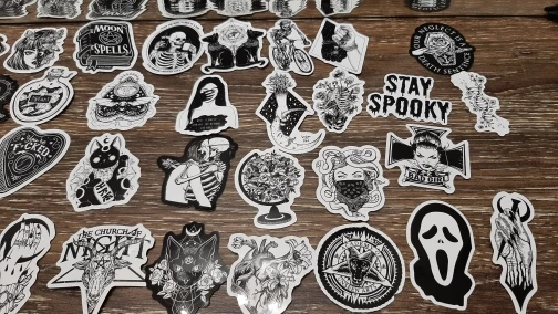 Отличная печать, мягкая и глянцевая бумага высокого качества, 50 штук идеально подходят для тех, кто любит готику, вы можете украсить все, что хотите, так как они прилипают Ну и не осыпайтесь, есть черепа, тип wicca, альтернативных фильмов ужасов и иллюстраций, мне очень понравилось, это заняло меньше месяца, чтобы добраться в Мексику