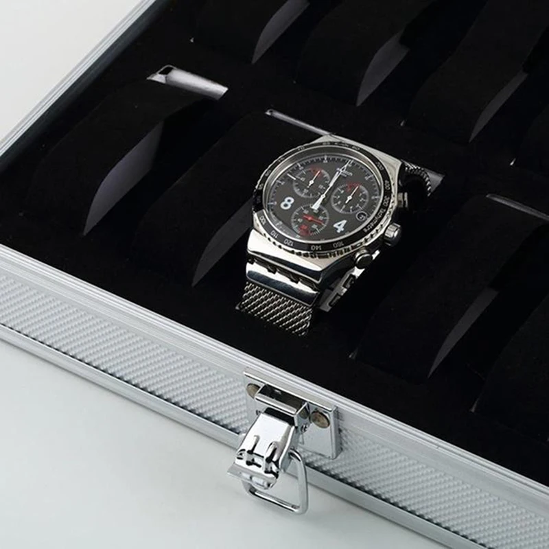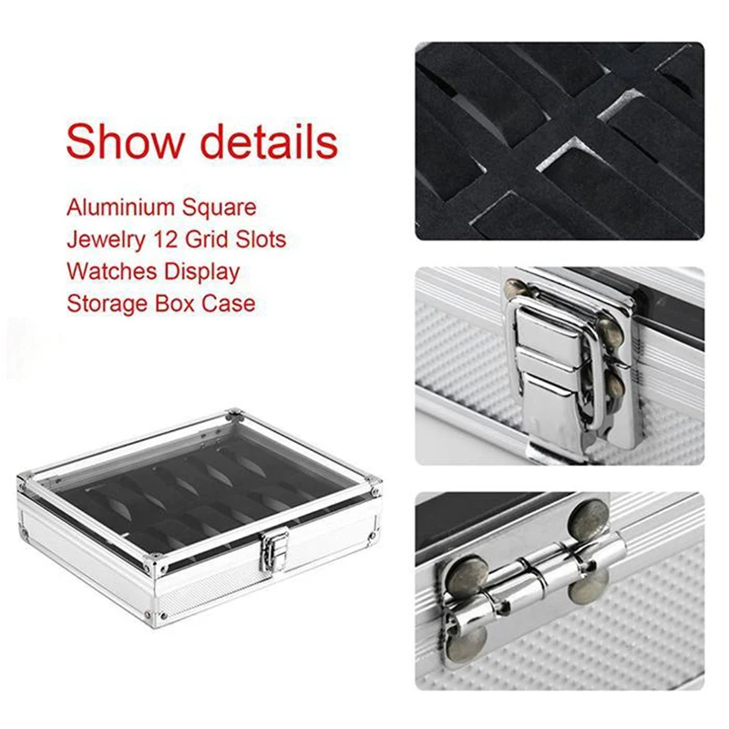 Полезная алюминиевая коробка для часов, 12 ячеек в сетку, коробка для хранения ювелирных часов, квадратный чехол, замша, внутри, прямоугольный держатель для часов
