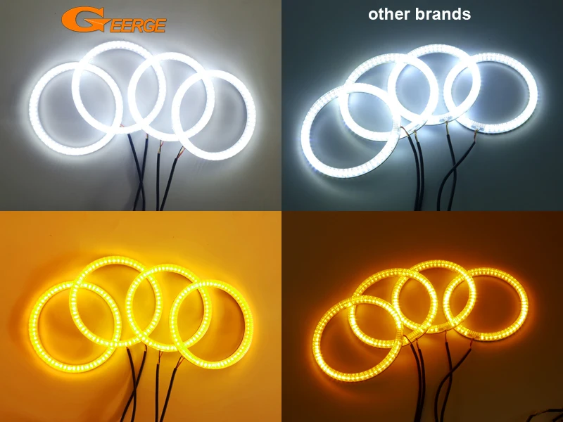 Он имеет два цвета: белый и желтый янтарь с функцией задержки переключения. Вы можете использовать янтарную часть в качестве указателей поворота или использовать ее просто как белые или янтарные кольца.