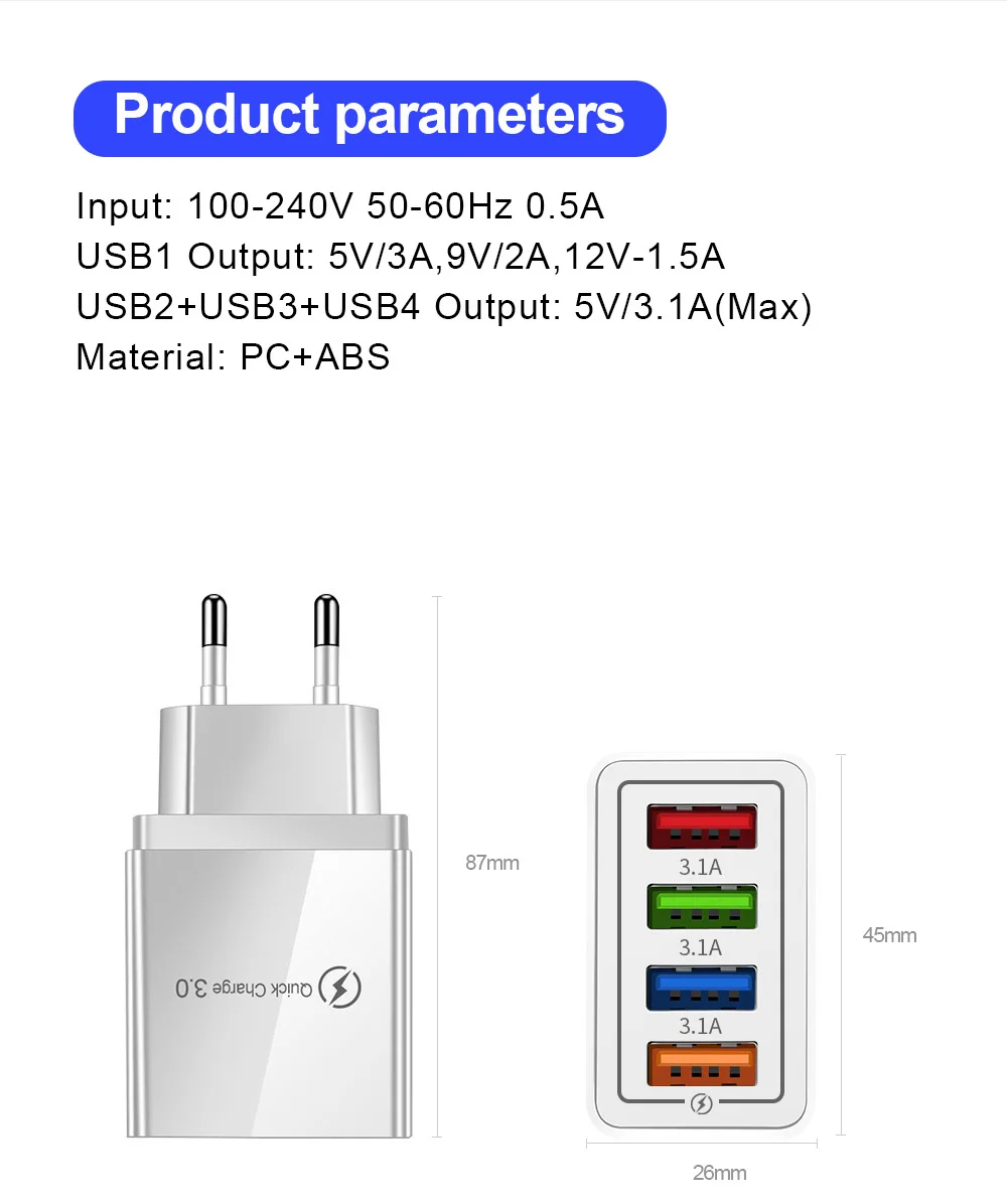 Устройство зарядное сетевое с USB-портом и поддержкой быстрой зарядки, 3,0