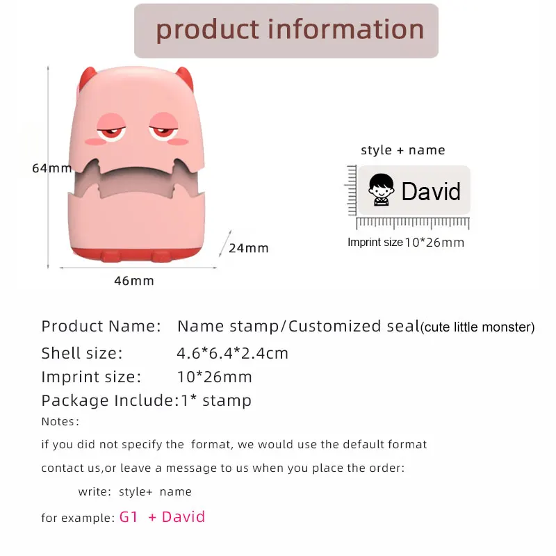 Описание deCustomized Baby штамп с именем DIY печать с именем ребенка нелегко выцветает безопасность штамп с именем наклейка предотвращает потерю ребенка печать наклейка милый маленький монстрНазвание продукта: штамп с именем/индивидуальный штамп для подписи/самоклеящаяся печатьРазмер оболочки: 4,6*6,4*2,4 смЦвет чернил: черный (по умолчанию), красный, зеленый, синий, розово-красный. Рекомендуем черный, моющийся.Размер отпечатка: 10*26 ммЯ предлагаю не более семи букв (для достижения наилучших результатов)Его оригинальные чернила можно использовать более 800 раз. Этого достаточно для случайного использованияНапишите свой любимыйКод стиля и имя нам.Например: G1 + DavidЗдравствуйте, друг. Для того чтобы у вас был лучший эффект, настоятельно рекомендую просто использовать имя и не использовать картинки!