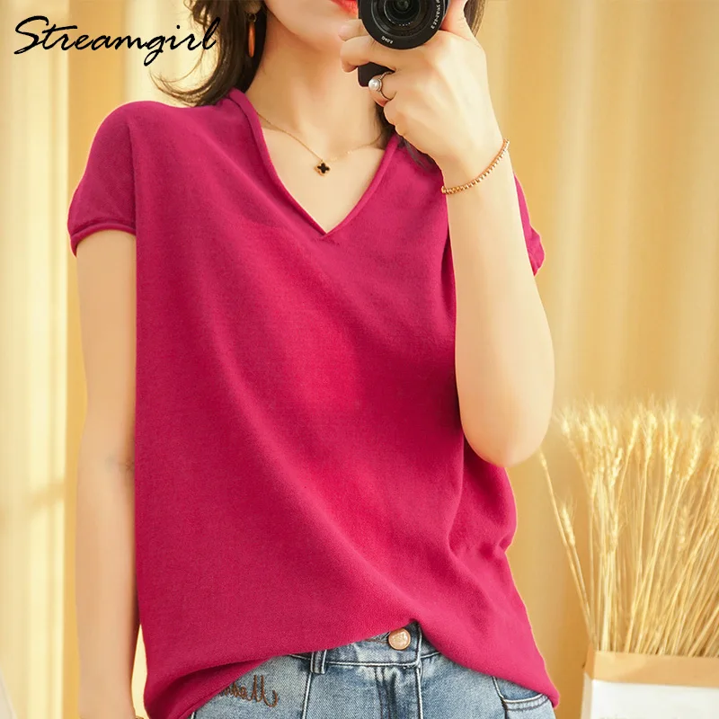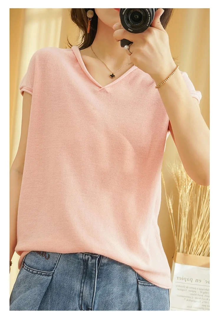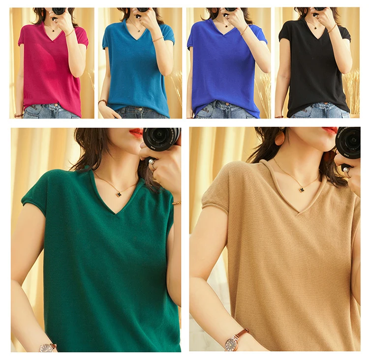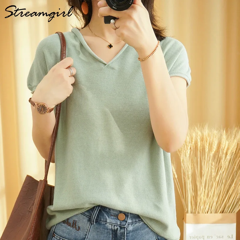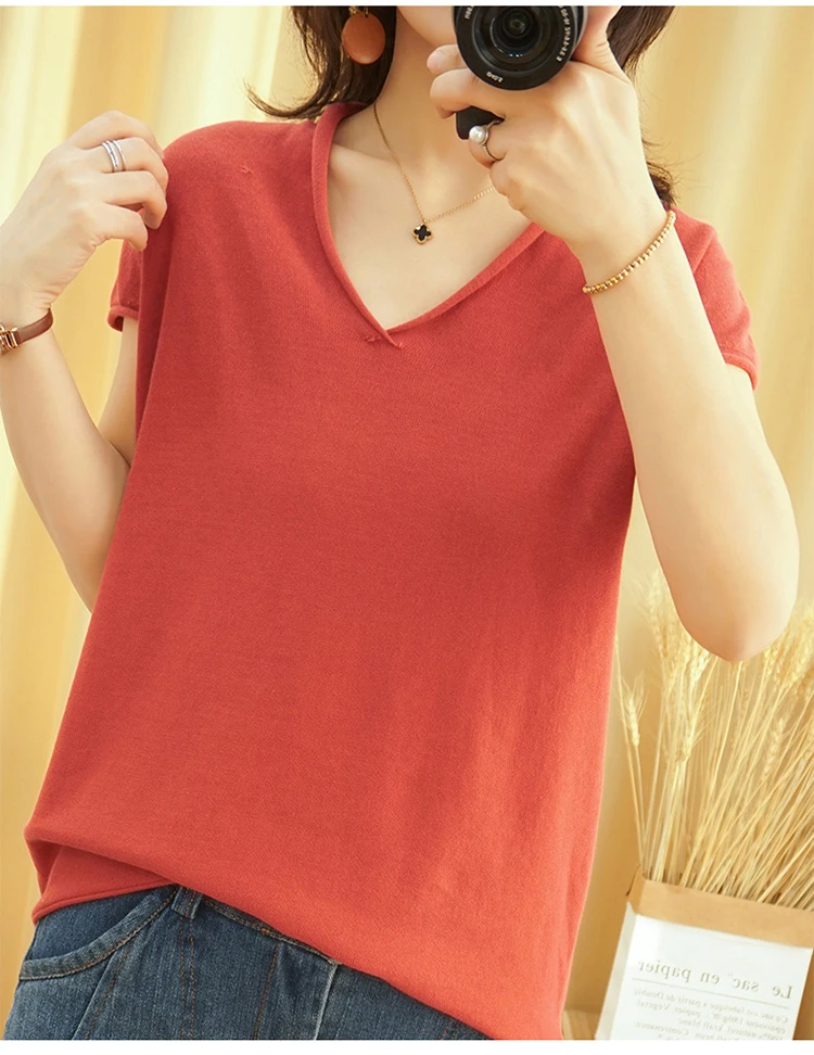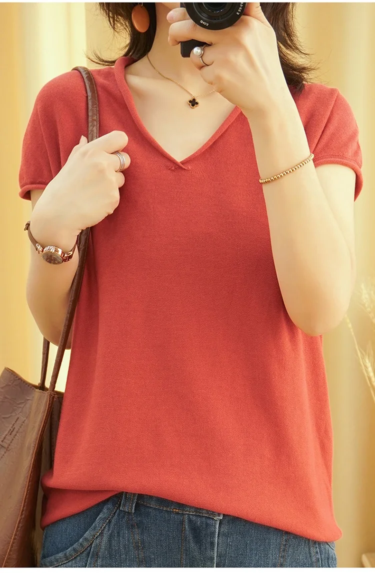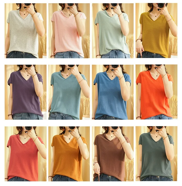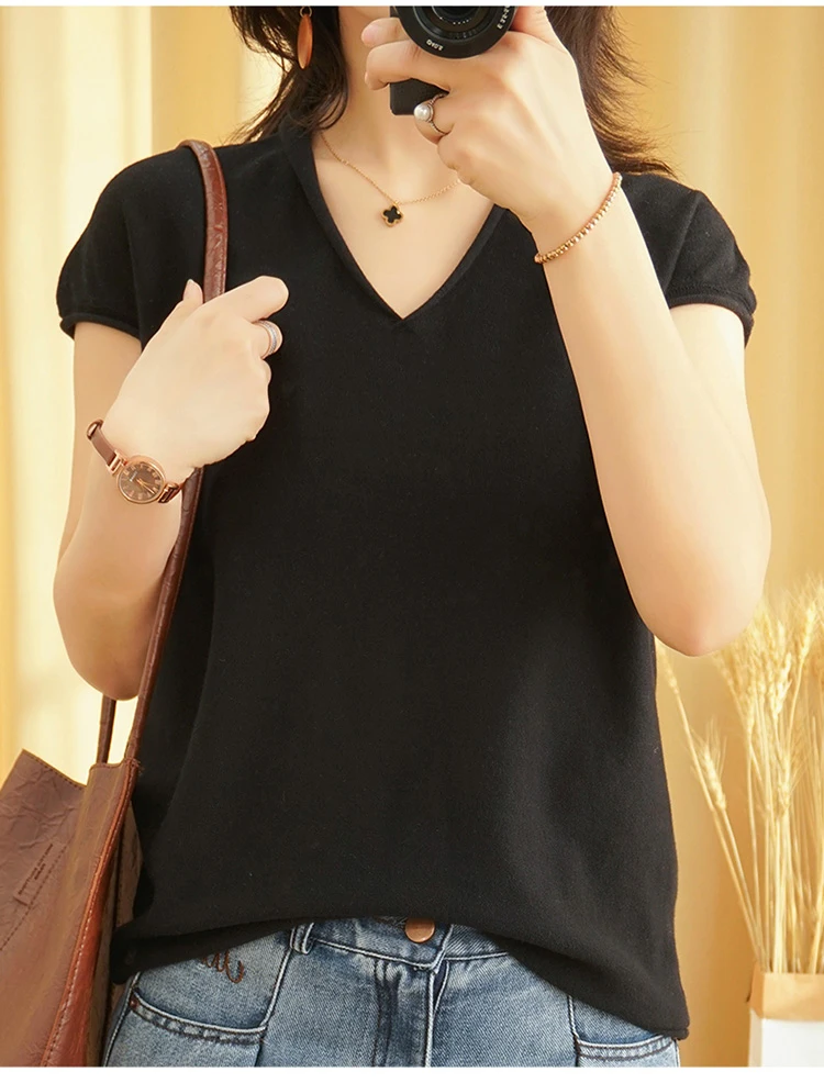 Женские футболки, лето 2021, трикотажная футболка с V-образным вырезом, Женские базовые черные хлопковые футболки, женские футболки с коротким рукавом 2021