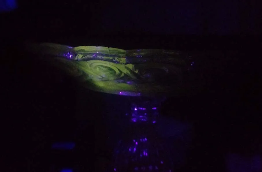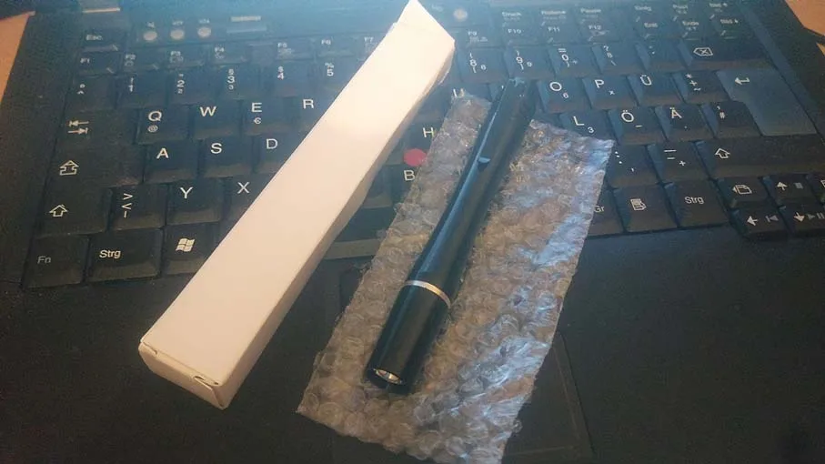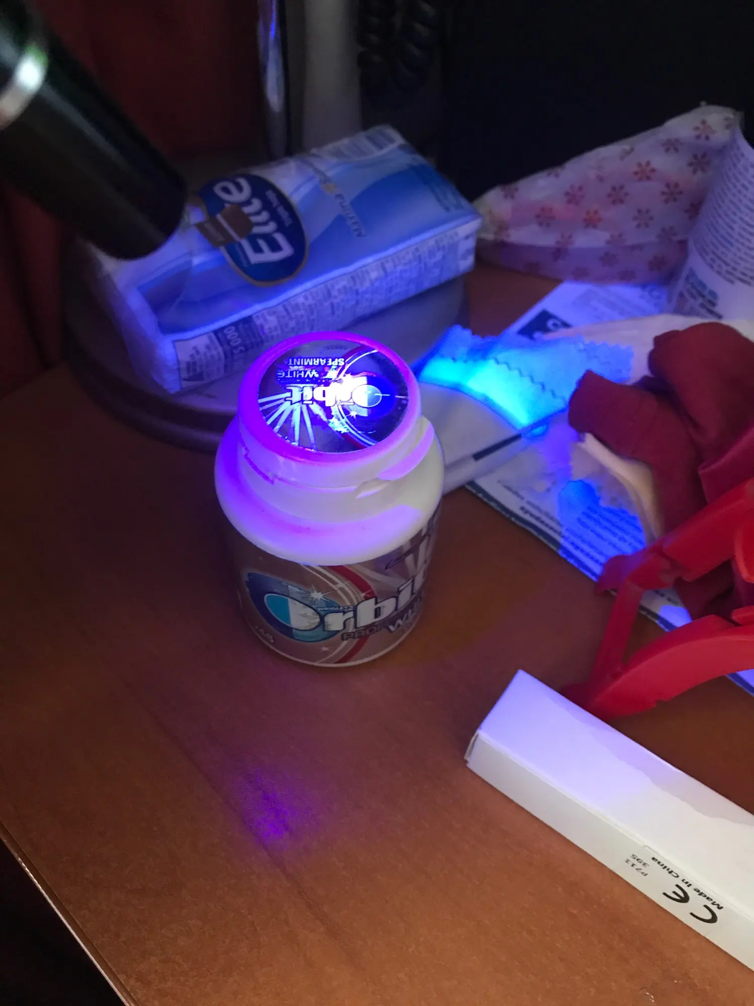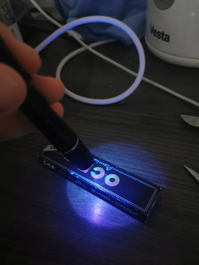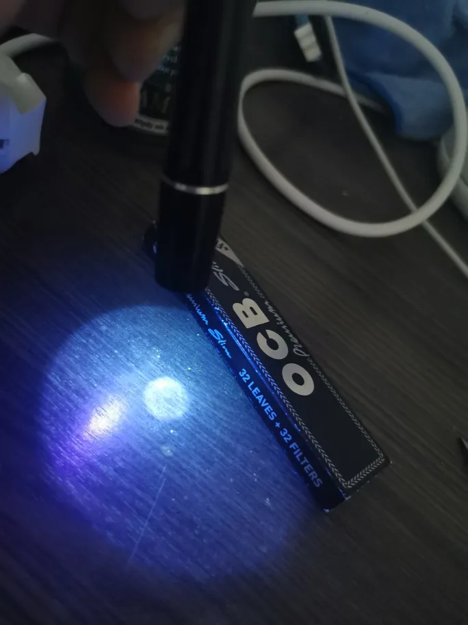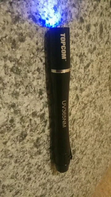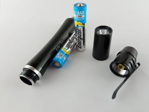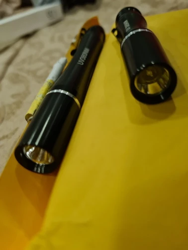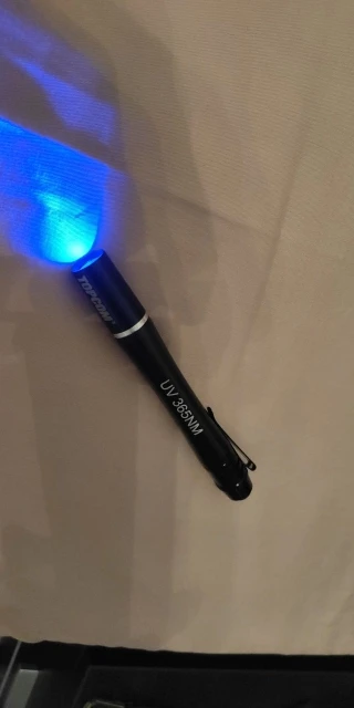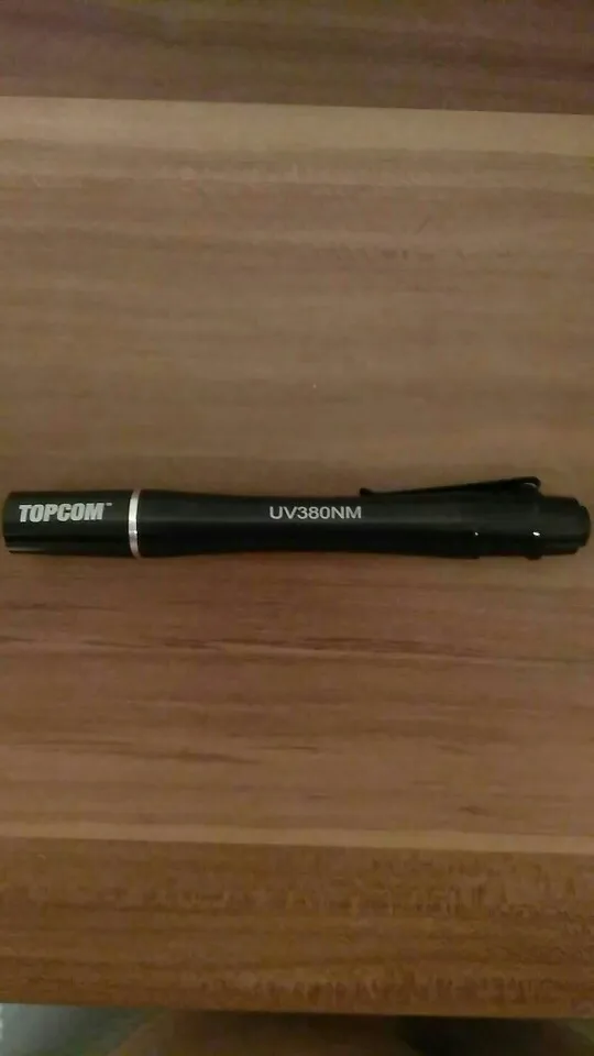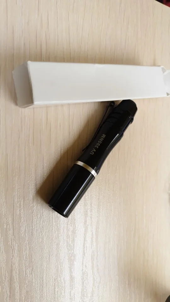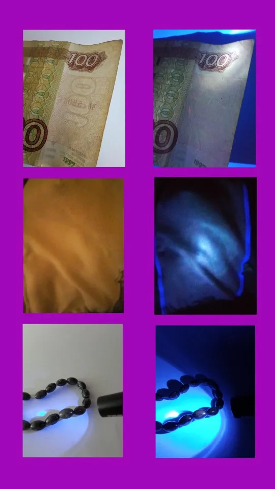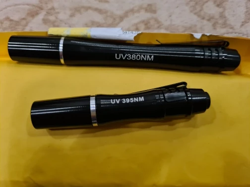 Посылка пришла очень быстро. Светит очень слабо, но ультрафиолет реально есть, проверено на люминофоре светодиодной лампы и на карте виза. На деньгах светятся только волокна, и то слабо, а полоска нет, так что никаких 365 нм тут нет, только 395 нм (хотя заказывал 365 и на фонарике написано тоже 365), поэтому минус одна звезда. Очень удобно проверять солнцезащитные очки, выяснил, что старые очки совершенно не фильтруют УФ, люминофор как светился так и светится, а новые отсекают УФ полностью.