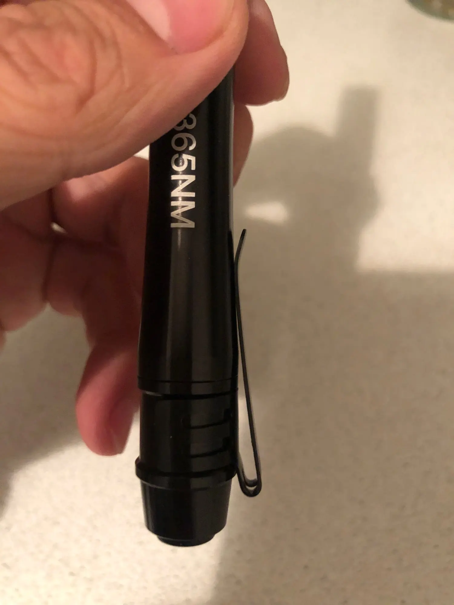 Нет длины волны и логотипа. Если вы посмотрите внимательно, есть отметки, которые выглядят так, как они были потерты. Тем не менее, свет выглядит белым на небрежный глаз, поэтому я думаю, что он, вероятно, 365 нм. Товар не аккуратный, поэтому я установлю его как ② 4.