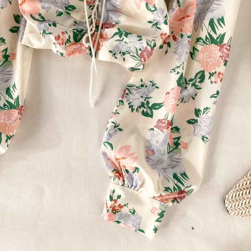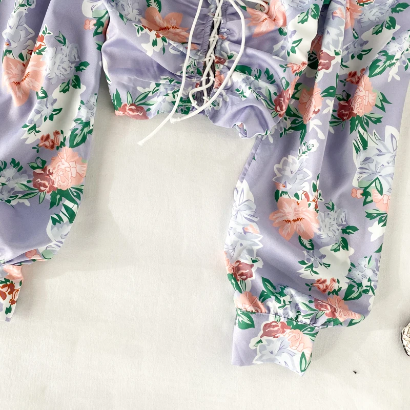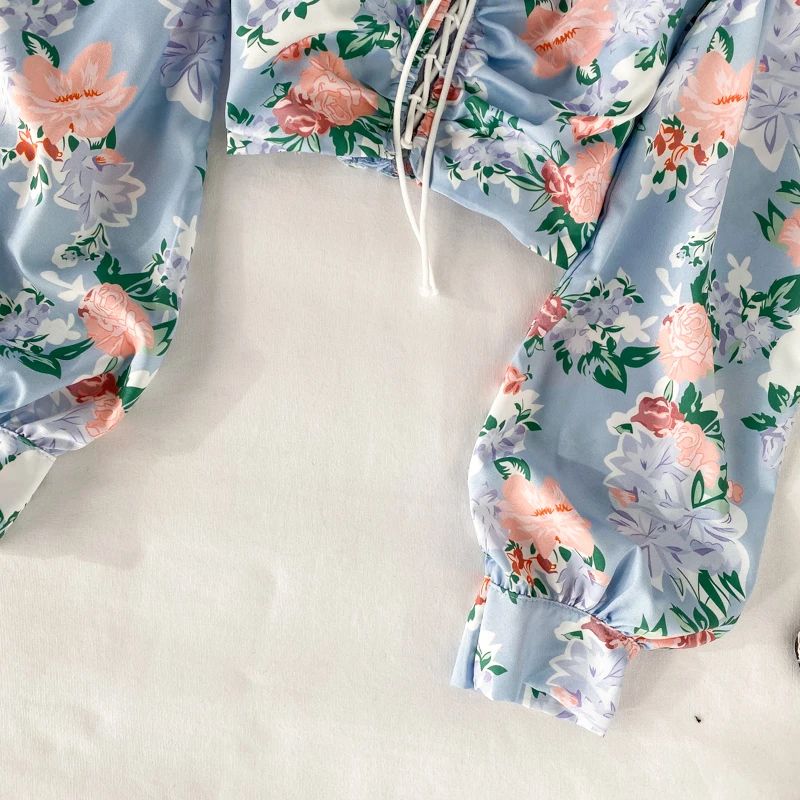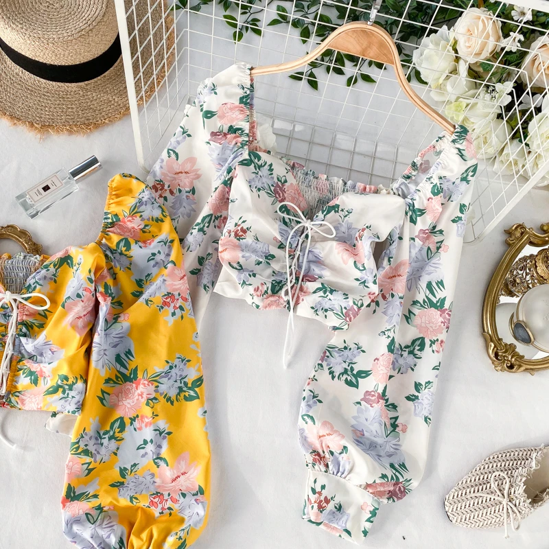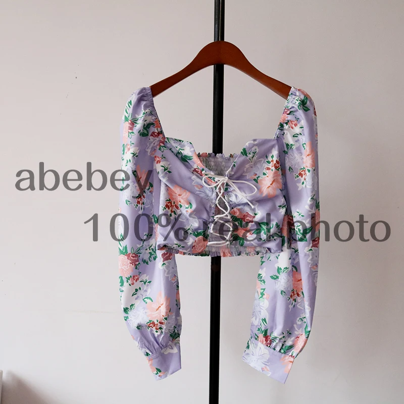 Женский короткий эластичный Топ в стиле ретро, облегающий короткий топ с длинными рукавами-пузырьками и квадратным вырезом, блузка с милым принтом, K719