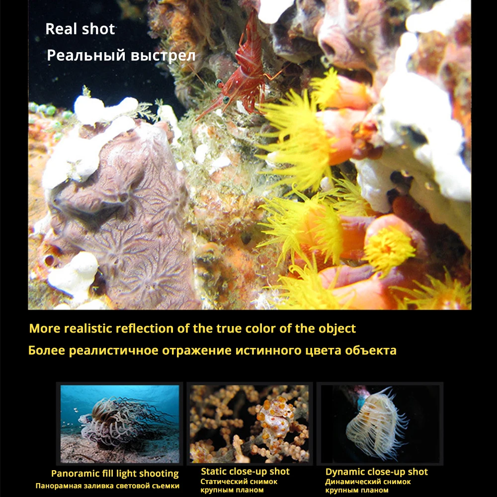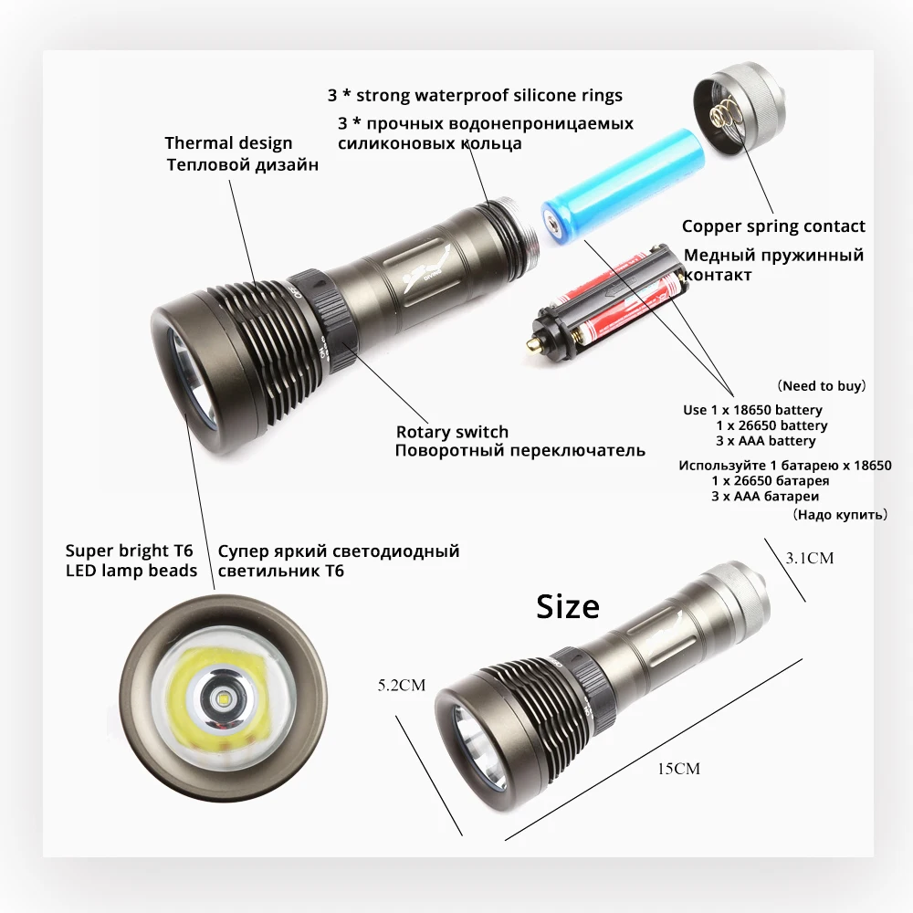 * Оснащен высококачественным светодиодный Т6 с более чем 50000 часов срока службы. Максимальная выходная яркость до 1600 люменов, дает вам супер яркий белый светильник под водой. * Поверните переключатель, левое вращение включает режим подсветки, а правое вращение включает режим помощи SOS. Подходит для различных ситуаций. Непрерывное время работы, но не более чем на 1-1,5 часов. * Изготовлен из AL-6061-T6 авиационного алюминия с военным регулированием III жестким анодированным покрытием, стойкостью к истиранию и коррозии в морской воде. * Специальная конструкция герметизации с водонепроницаемым уровнем IP68, доступна под водой 100 метров. Расстояние подводного освещения может быть 80 метров. * Профессиональное осветительное оборудование для подводного плавания и Сноркелинга. Также используется для кемпинга, пеших прогулок, треккинга, охоты, рыбалки и т. д.