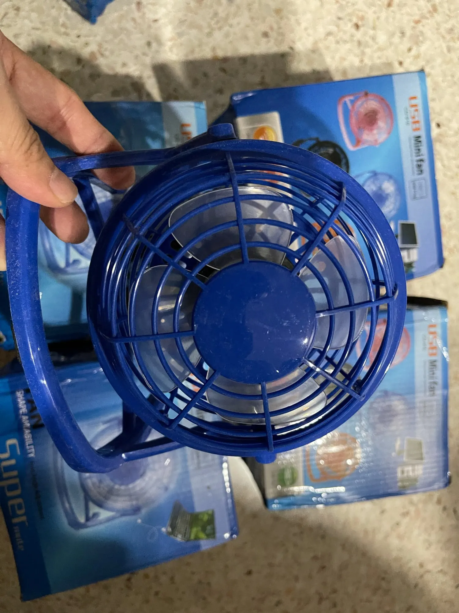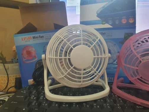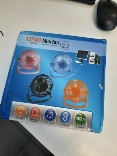 Коробка помнялася в дорозі і пропеллер злетів з мотора. Я за допомогою викрутки розкрутив вентилятор і вдягнув пропеллера. Вентилятор працює від USB порта. Вітер створює слабенький, але і працює тихо. Ніжка крутиться. Ззаду є кнопка.