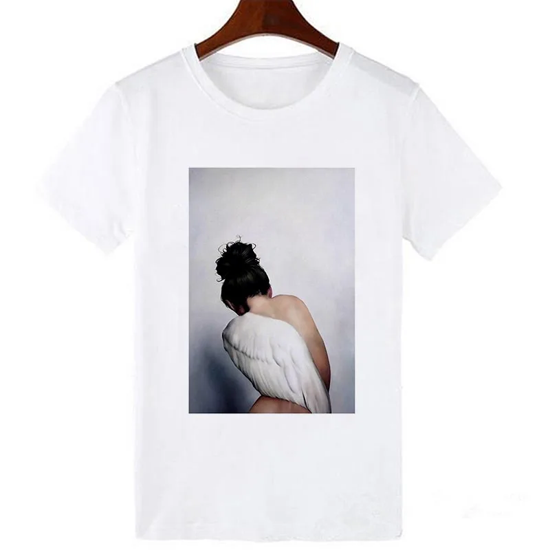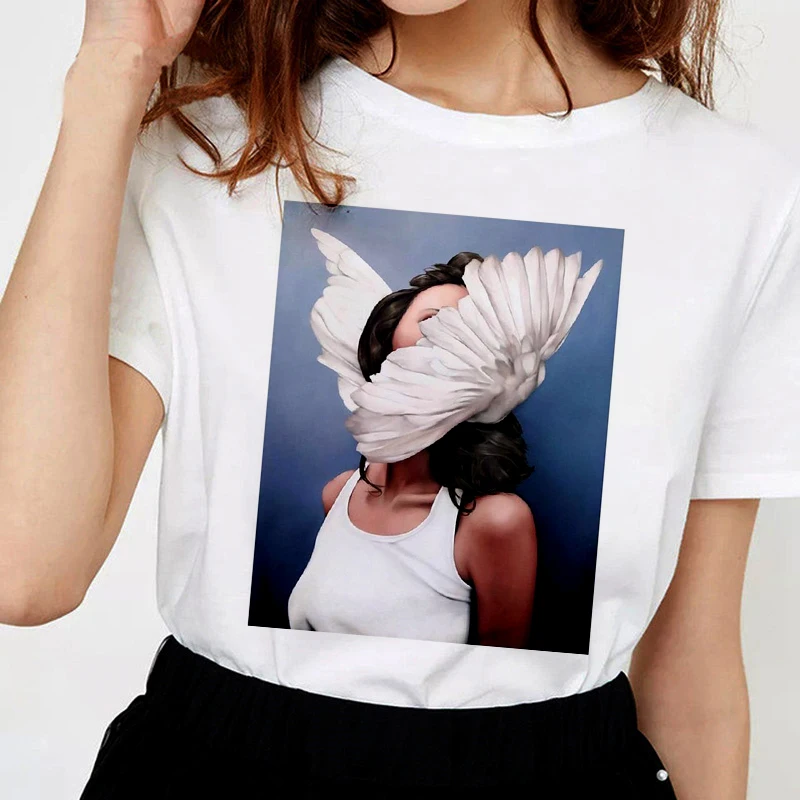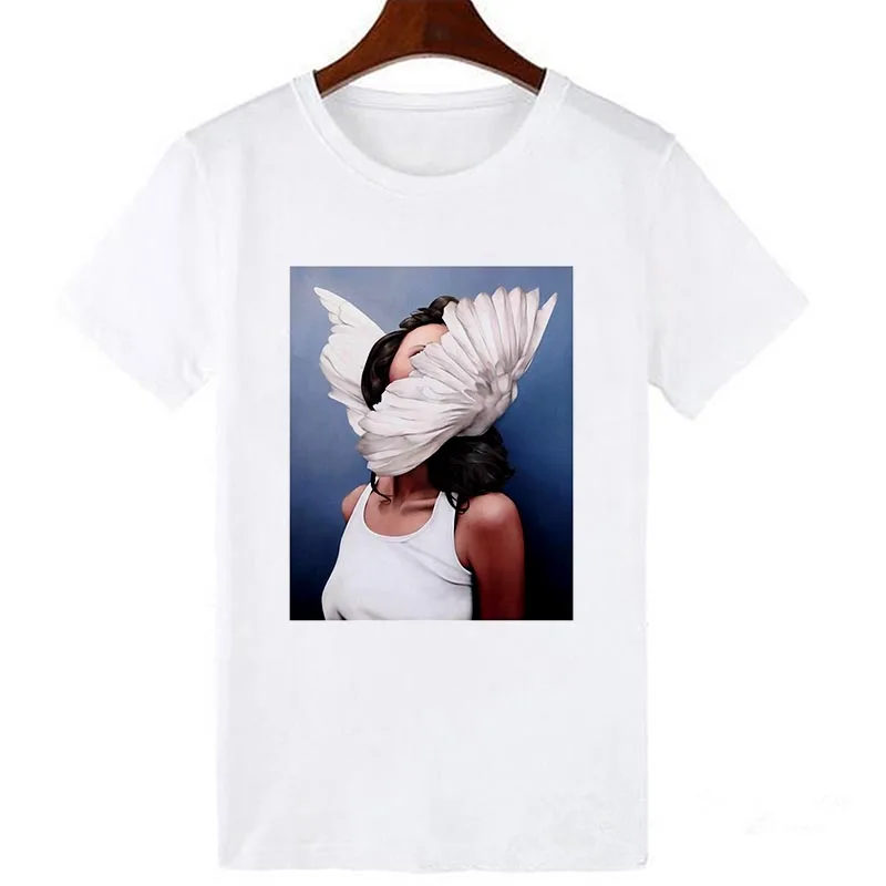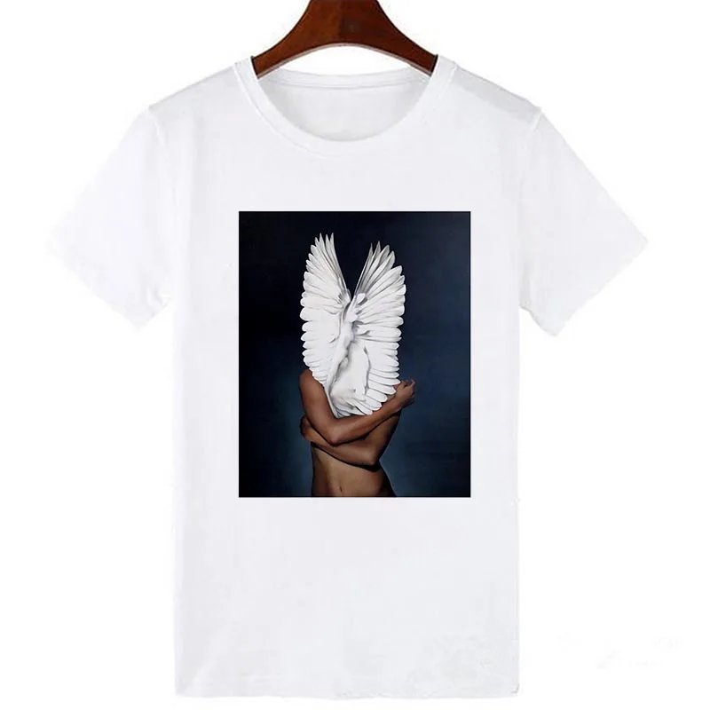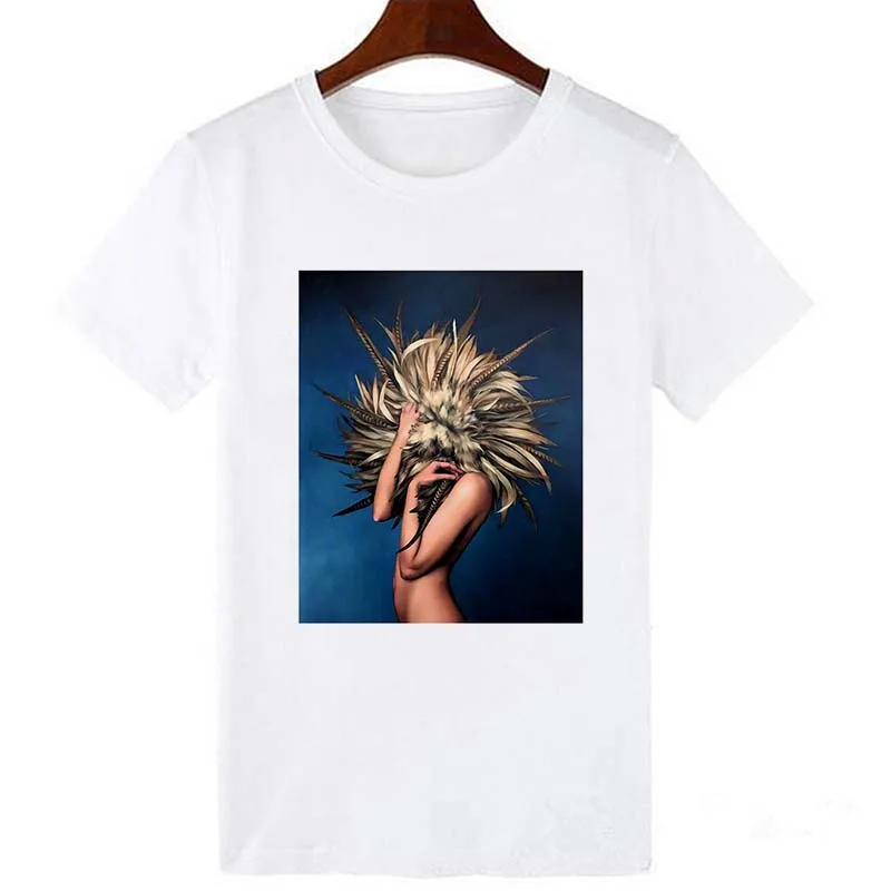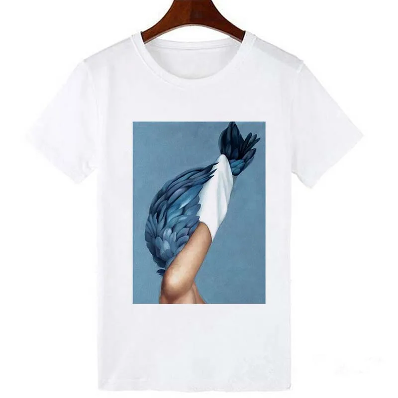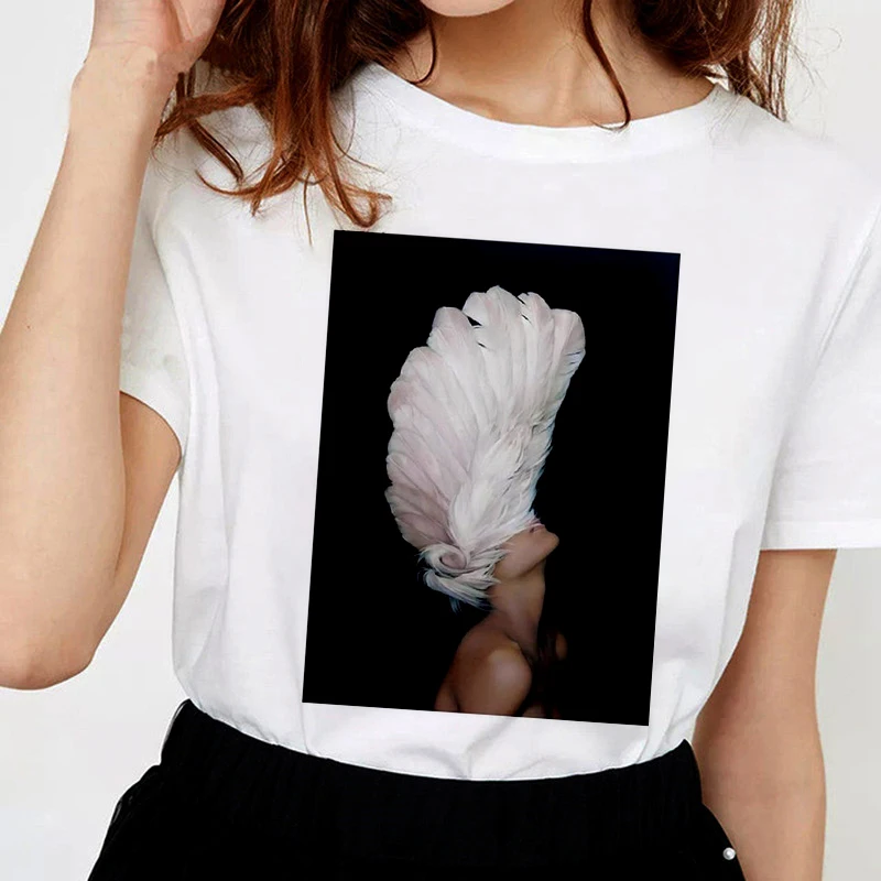 Женская Уличная Сексуальная футболка с принтом перьев Harajuku, летняя футболка с короткими рукавами, Модная белая повседневная одежда, футболка