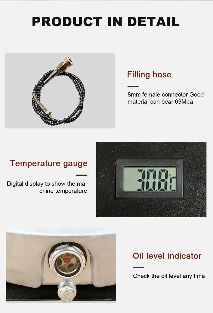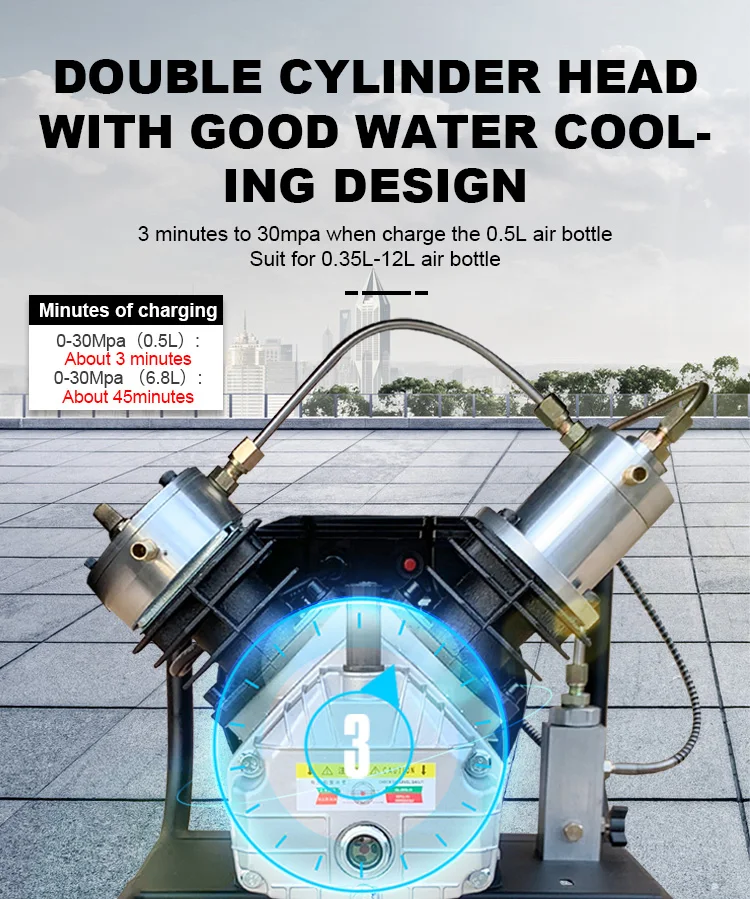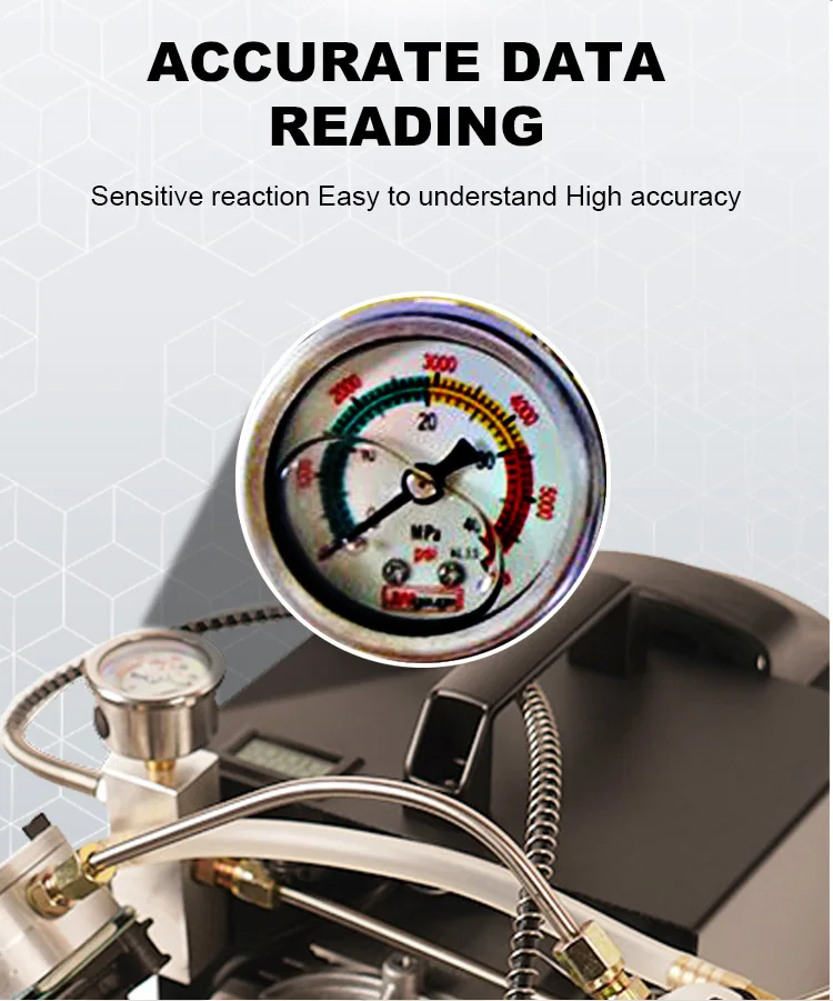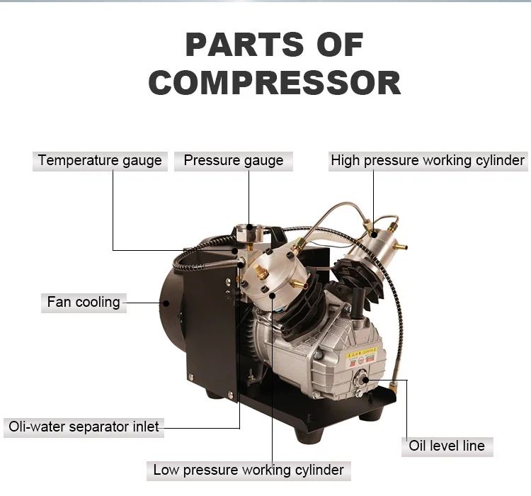 Модель:TXEDM041Вес нетто: 29 кг (110 В)/ 28 кг (220 В)Номинальная мощность: 2200 ВтСистема охлаждения: охлаждение водой и вентиляторомШум: 72 дБРазмер: 530 мм × 400 мм × 480 ммНапряжение питания: 110 В/220 ВЭтап сжатия: два этапаРежим смазки: Тип брызгСкорость надувания: 2800р/минTXEDM041-это мини двухступенчатый цилиндрический компрессор, переносной компрессор, легко переносится., рабочее давление 300 бар/4500psi/30mpa, воздушный насос высокого давления, скорость надувания: 2800r/мин.TXEDM041 Двухступенчатая головка компрессора цилиндра, быстрая скорость наполнения, подходит для заполнения бака большой емкости.TXEDM041 Встроенная сливная система, эффективно отделяет масляную воду и примеси. Используйте разрывной диск, он войдет в систему защиты от взрыва давления более 45 МПа, убедитесь в безопасности.Эта модель является общей версией.Он использует Манометр с точными показаниями, вам нужно выключить вручную.