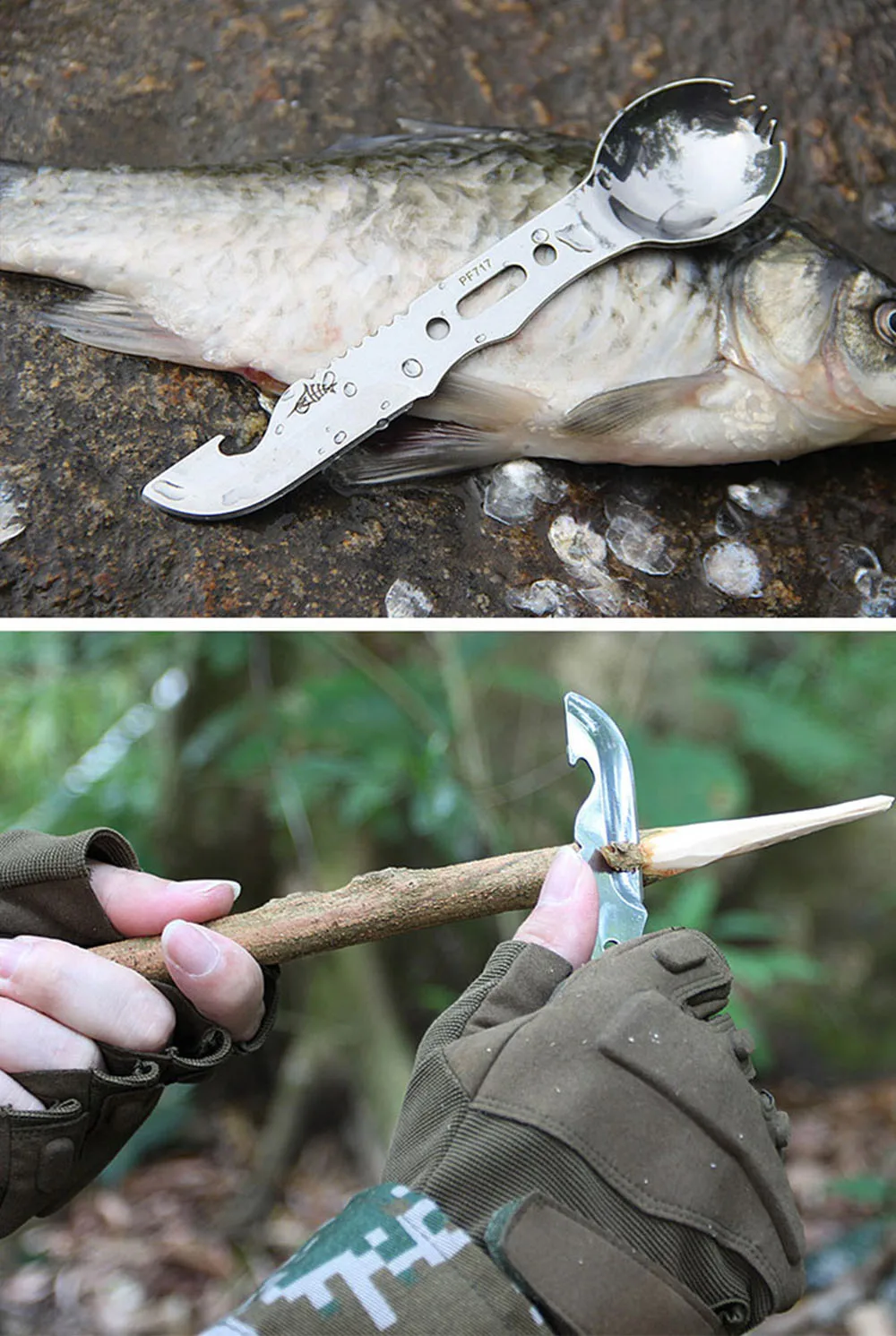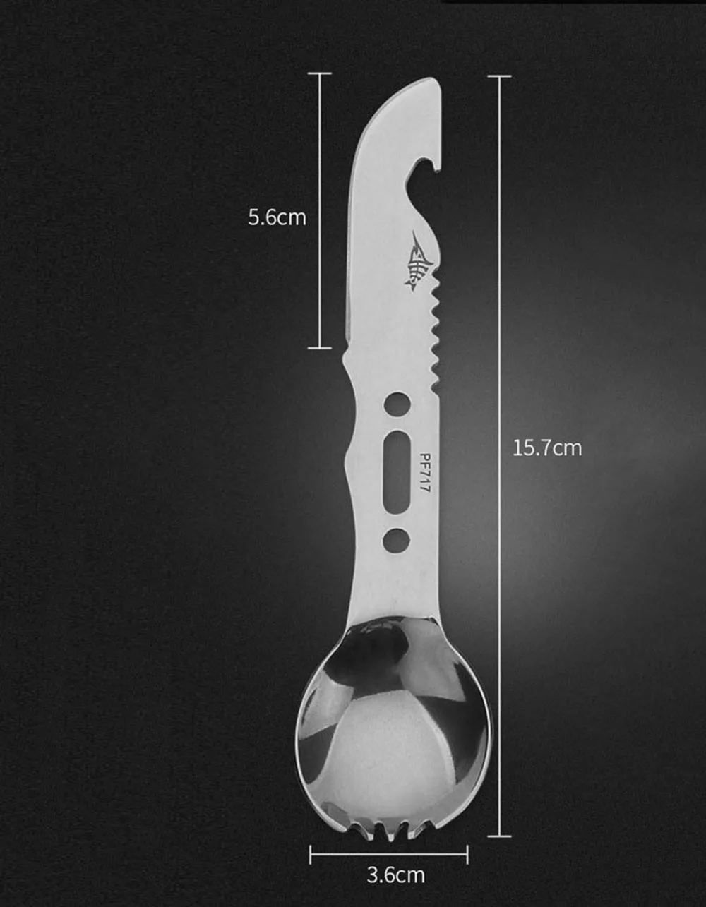 Изготовлен из нержавеющей стали, достаточно прочный и прочный.С открывалкой для бутылок, это удобно для вас.Дизайн вилки и ложки, можно использовать в качестве посуды.Многофункциональный, отлично подходит для путешествий на открытом воздухе.Экологичный и Безопасный в использовании.В пределах ложки, вилки, открывалка для бутылок, консервный нож, свисток, рыбные чешуи и гарпунОтличные маленькие подарки для друзей и родственников.