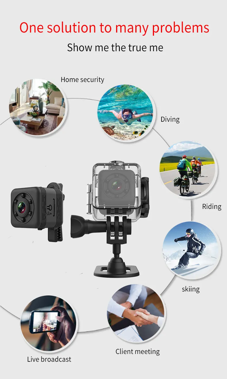 ● 30 м водонепроницаемый дизайн для высокой производительности ● Поддержка циклической записи на tf-карте: Нет необходимости удалять предыдущее видео. ● Инфракрасное ночное видение: 6 инфракрасных ламп, мощный эффект ночного видения. -Мини-размер: небольшой форм-фактор, портативный Портативный DV DC, подходит для различных случаев. ● Подключение Wi-Fi: Поддержка Wi-Fi подключения, передача видео в режиме реального времени, можно использовать мобильный Трафик данных для управления камерой, вы также можете использовать управление Wi-Fi. ● Долгое время работы: встроенный литий-ионный аккумулятор емкостью 300 мАч, время работы до 240 минут. ● Автономный Wifi для автоматического подключения к телефону