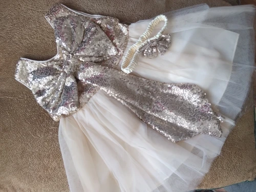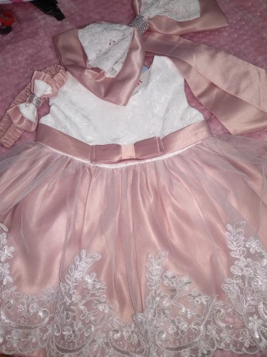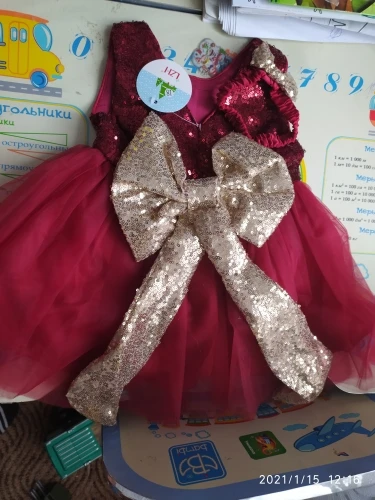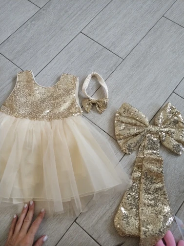 Красивое платье , кое где паетки осыпались , но не критично , за такую цену . Бант на голову не очень красивый , заменили другим , в остальном платье шикарное . На 7 месяцев рост 70 , брала размер 6м , в притык , хотелось бы что бы юбка была подленее, но в целом отлично , если ребёнок чучуть повыше лучше уже брать следующий размер