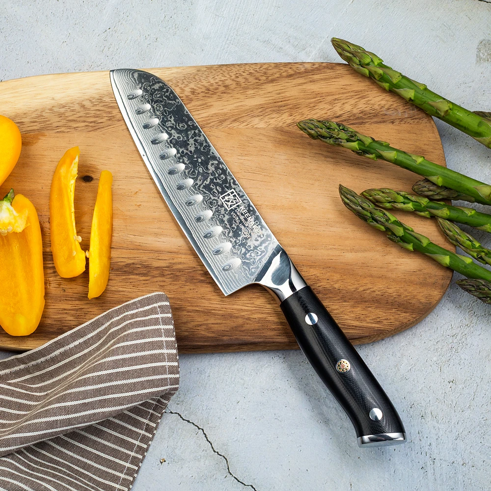 -7 дюймов Santoku Ножи:Weight-243g, длина лезвия-7 дюймов (178 мм), длина ножа-12 дюймов (305 мм),Thickness-2.2mm