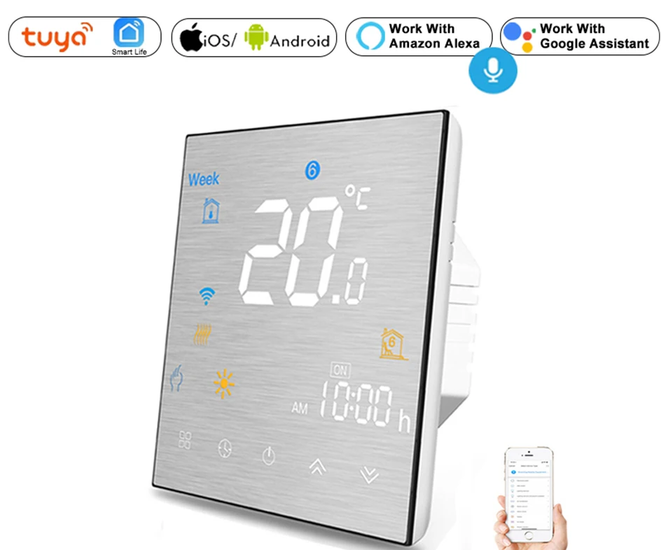 Tuya Smart Life WiFi Пульт дистанционного управления умный термостат регулятор температуры для воды Электрический пол Отопление вода/газовый котел работает с голосовым управлением Alexa Google домашний еженедельный графикПримечание:BHT-3000-GALW для нагрева воды с wifiBHT-3000-GBLW для электрического отопления с wifiBHT-3000-GCLW для водного/газового котла с wifiНапольный датчик включен для электрического термостата с подогревом пола.Термостат для нагрева воды и водного/газового котла не включает Датчик пола. При необходимости выбирайте вместе при размещении заказа.Особенности продукта:1. Металлическая матовая панель:Потрясающая серебряная рамка открывает вашу современную жизнь, а квадратный дисплей также помогает защитить ваши глаза. Термостат сфокусирован на создании простых, человеческих, восхитительных ощущений для вашего дома, и этот вид цвета подходит для различных стилей декора.2. Умный дом совместим:Работает с Alexa Google Home. Термостат обеспечивает наиболее удобную температуру для вашего дома, где бы вы ни находились, используя Голосовое управление.3. Пульт дистанционного управления для смартфона:Удаленно Управляйте своей домашней температурой, чтобы достичь улучшенного комфорта с помощью смарт-приложения, легко работать на смартфонах в любом месте.4. 5 + 2 программируемые:Поддерживает полные автоматические программы или ручную настройку 5 + 2 дней еженедельного расписания 6 этапов ежедневно, обеспечивая вам максимальное удобство и комфорт. Память данных при выключении питания.5. Особенности и функции:Эта серия была разработана для контроля нижнего пола, нагрева воды или водно-газовой котельной системы. Эти блоки предназначены для использования в коммерческих, промышленных, гражданских и бытовых свойствах. Обеспечить максимальное и всестороннее удобство вашей умной жизни.Упаковочный лист:1 * термостат (по вашему выбору) + 2 * винты + руководство по установкеВопрос и ответ:1. В: включает ли коробка настенную пластину?О: Нет, нет. Настенная пластина не требуется для подключения термостата. Это сочетание с пластиной и стеновой панелью.2. В: включает ли он функцию Wi-Fi?О: Да, этот тип нового термостата поддерживает функцию Wi-Fi.3. В: Могу ли я сам программировать расписание?О: Да, наш термостат программируется. Вы можете свободно программировать свой график.4. В: Могу ли я управлять термостатом, если меня нет дома?О: Да, вы можете дистанционно управлять нашим термостатом и регулировать температуру.5. Вопрос: работает ли это с Google Home?О: Да, да.6. Вопрос: Есть ли у этого термостата блокировка экрана, чтобы предотвратить действия гостей или детей с настройками?О: Да, да. Он имеет полностью заблокированный режим, который предотвращает любые изменения.7. В: Могу ли я использовать c-провод?О: нет, c-провод не требуется для нашего термостата.