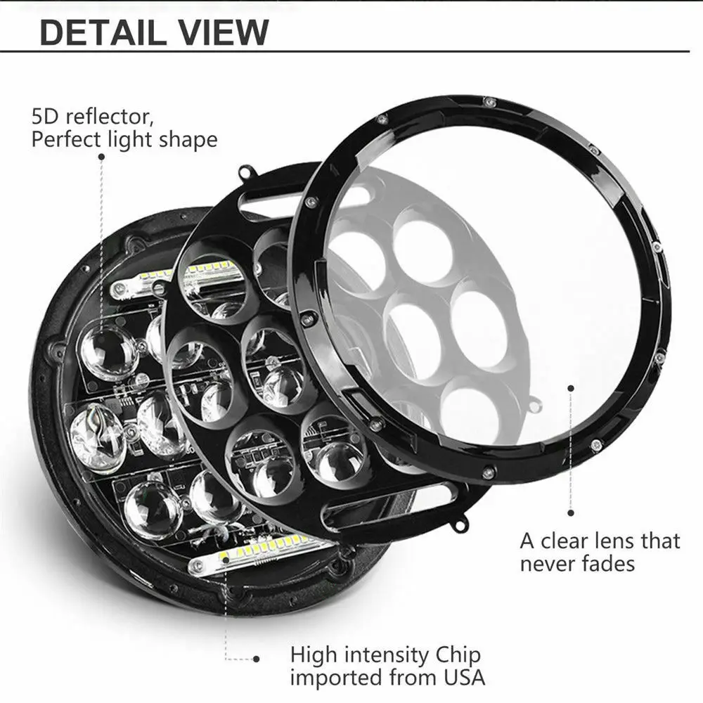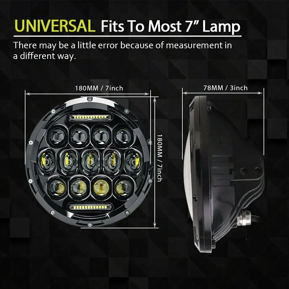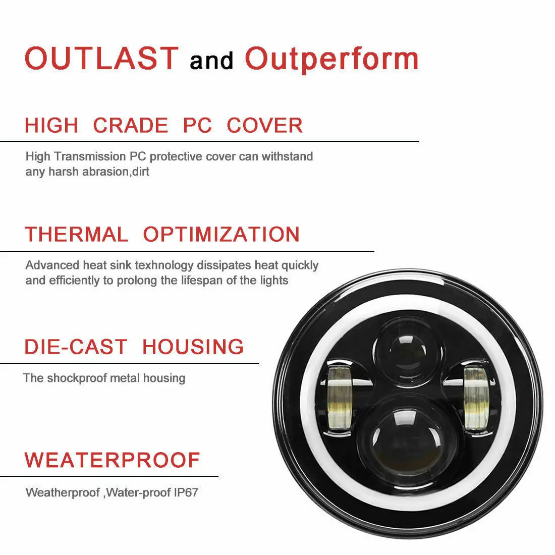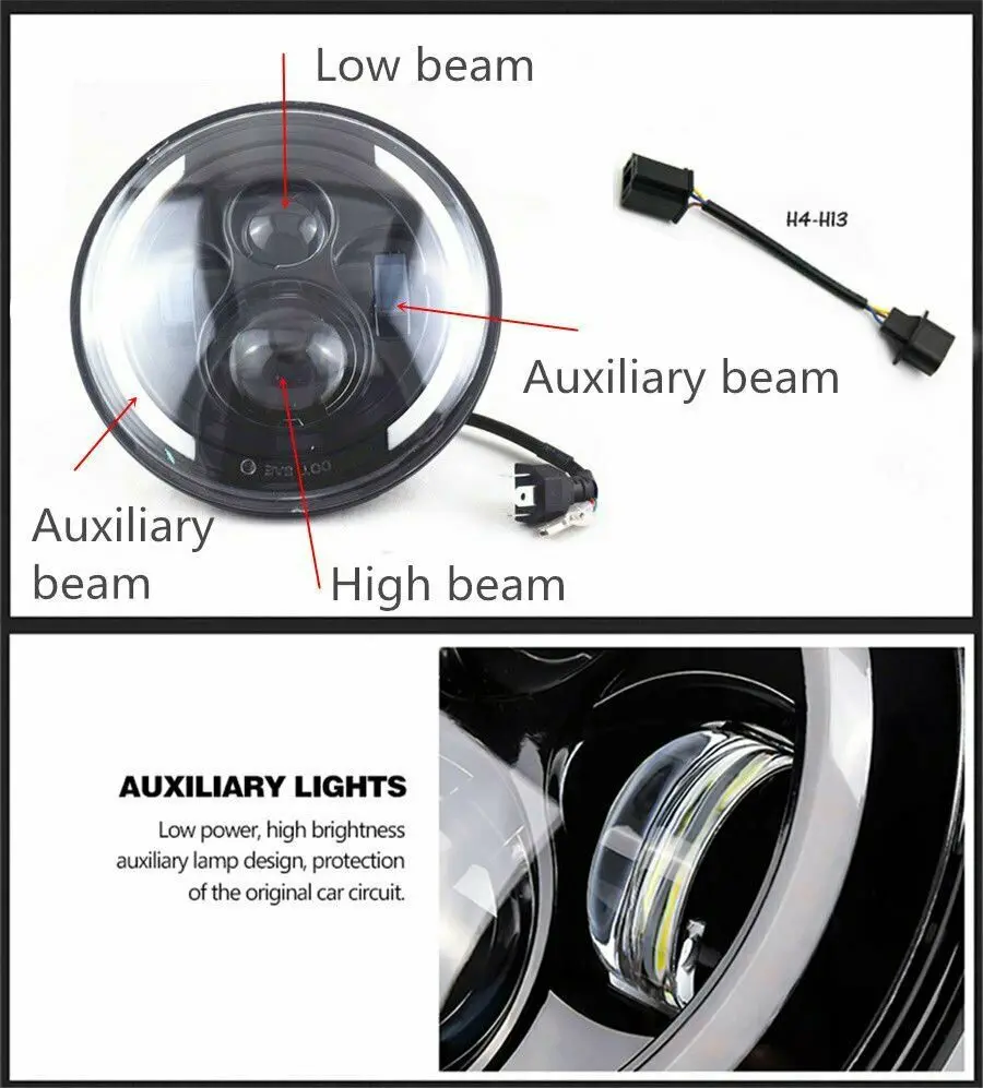 Применение: Для Jeep Cj-5 1955-1983 Для Jeep Cj-7 1976-1986 Для Jeep CJ-8 1981-1985 Для Jeep Wrangler (TJ) 1997-2006 Для Jeep Wrangler (JK) 2007-2014 Для HummerH1 1992-2006 Для HummerH2 2003-2009 Для мотоцикла Harley Davidson Для Mercesdes Benz G Для Land Rover defender Для грузовика, внедорожника 4x4 Характеристики: Цвет корпуса: черный Напряжение: DC12V-30V Цветовая температура: 6000 К Мощность СВЕТОДИОДНЫЙ да: 60 Вт Луч: дальний-Ближний свет + ДХО Срок службы: более 50000 часов Цвет ангельских глаз: янтарный или белый, вы можете изменить его самостоятельно. Материал: литой корпус из алюминиевого сплава, прозрачные линзы из ПК с твердым покрытием Размеры: (7 дюймов) 7,01 "x 7,01" x 3,07 "(178 мм x 178 мм x 78 мм) Особенности: 7-дюймосветодиодный ные фары многофункциональны-ореол может быть белым или янтарным. Янтарь для сигнала поворота, белый-Для DRL. Более быстрый отклик при включении/выключении, поразительный предупреждающий эффект для повышения безопасности вождения. Погодостойкость, низкое энергопотребление, длительный срок службы. Простая установка-подключи и работай. Посылка 1 х светодиодные фары 1 x разъем H4-H13 (Инструкция по установке не входит в комплект)