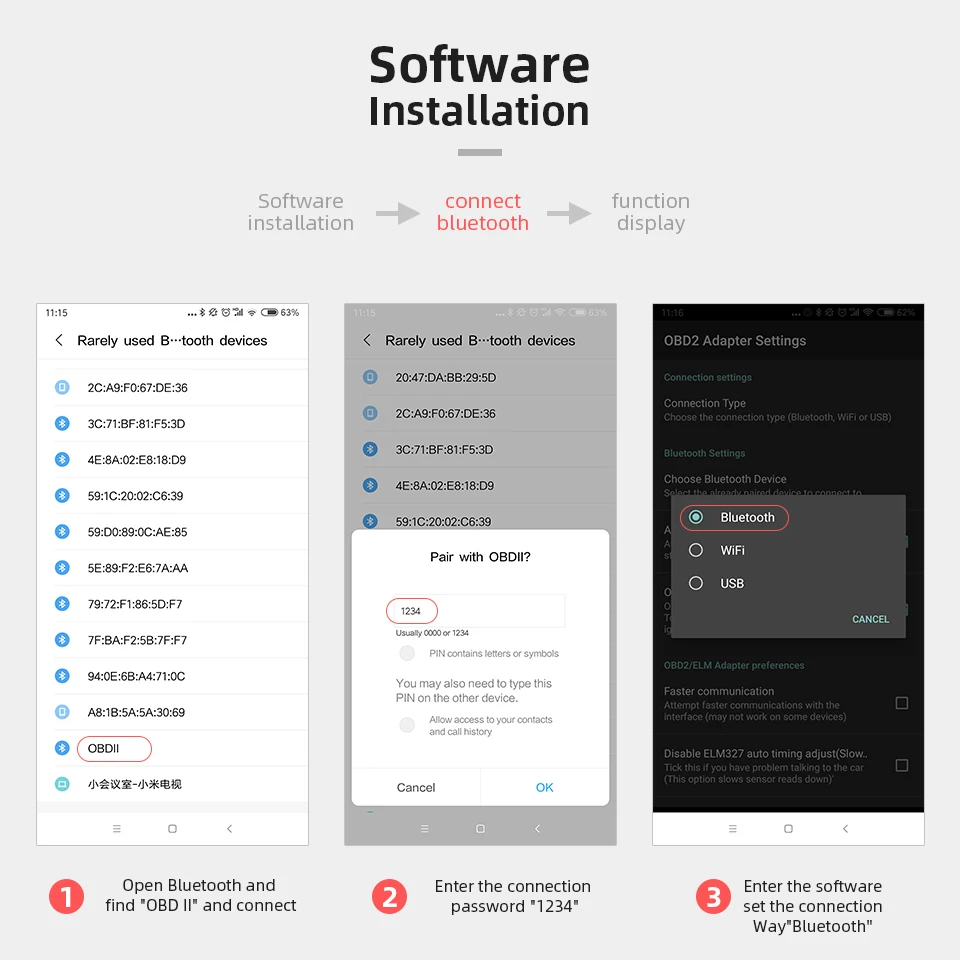 О: на телефоне android:1. Откройте «Настройки» вашего android и найдите BT из ELM327:OBDll, затем введите пароль 1234.2. Откройте крутящий момент -- etting --- адаптер OBD2 Settins --- Тип подключения --- BT --- back --- ChooseBT устройство --- OBDII[AA:BB:CC:11:22:33].