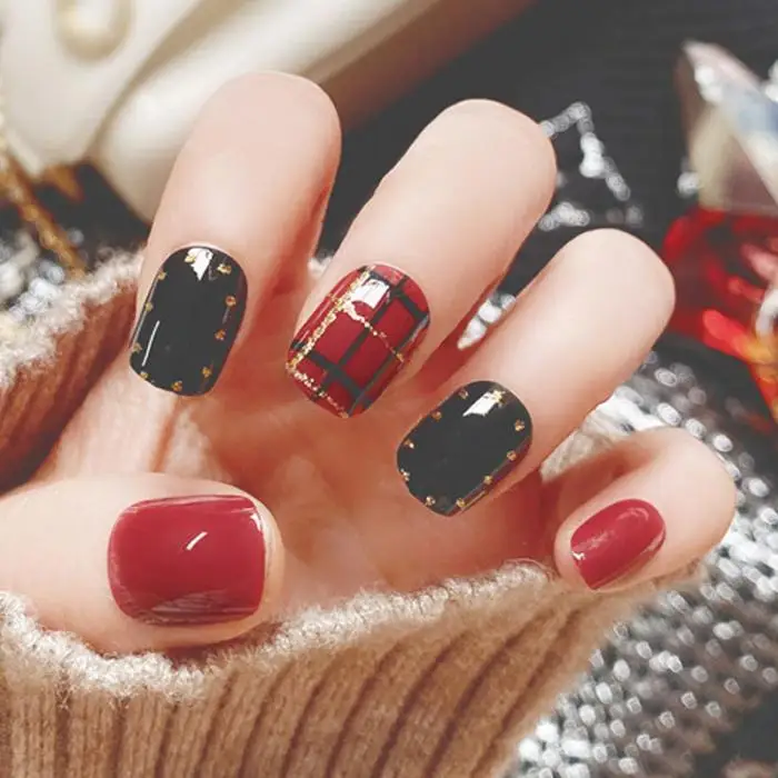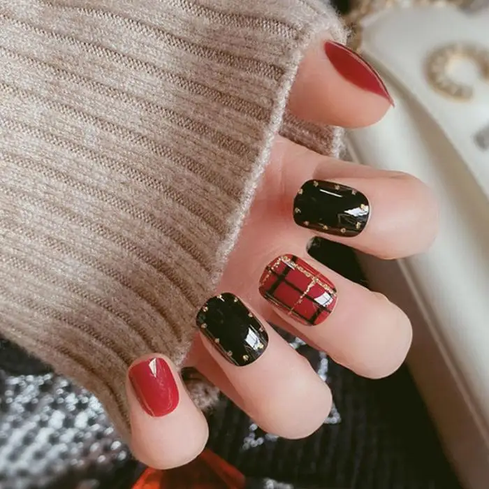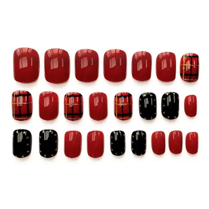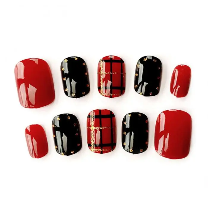 24 шт.коркор. новые высококачественные свежие красные и черные полосатые накладные ногти с дизайном и клеем носимые Короткие акриловые накладные ногти с полным покрытием