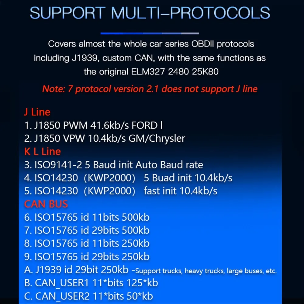Протоколы:Для V1.5:1. SAE J1850 PWM (41,6 K бод)2.SAE J1850 VPW (10,4 кбод)3. ISO9141-2 (Инициализация 5 бод, 10,4 кг бод)4. ISO14230-4 KWP (Инициализация 5 бод, 10,4 кг бод)5. ISO14230-4 KWP (быстрый старт, 10,4 кбод)6. ISO15765-4 CAN (11-значный ID, 500 кбод)7.ISO15765-4 CAN (идентификатор 29 бит, 500 кбод)8. ISO15765-4 CAN (11-значный ID, 250 кбод)9.ISO15765-4 CAN (идентификатор 29 бит, 250 кбод)Для V2.1:ISO 9141-2 (5 бод инициализации, 10,4 кбод)ISO14230-4 KWP (5 бод инициализации, 10,4 кбод)ISO14230-4 KWP (быстрая инициализация, 10,4 кбод)ISO15765-4 CAN (11bit ID, 500 кбод)ISO15765-4 CAN (29bit ID, 500 кбод)ISO15765-4 CAN (11bit ID, 250 кбод)ISO15765-4 CAN (29bit ID, 250 кбод)* Настройки по умолчанию (настраиваются пользователем)Выходной протокол: RS232Скорость передачи: 38400Светодиоды индикатора: OBD Tx/Rx, RS232 Tx/Rx, питаниеРабочее напряжение: 12 В, внутренняя защита от коротких замыканий/ПеренапряженияНоминальный ток холостого хода: 45 мА