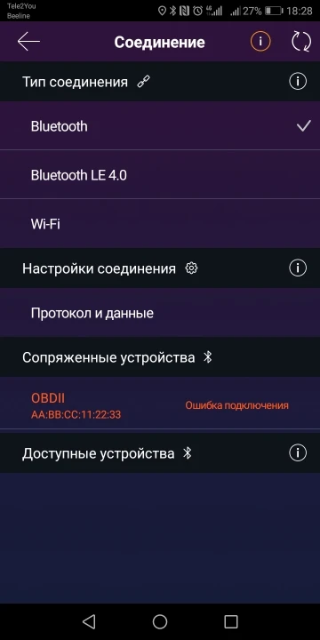 О: на телефоне android:1. Откройте «Настройка» вашего android и найдите BT из ELM327:OBDll, затем введите пароль 1234.2. Откройте крутящий момент -- etting --- набор адаптеров OBD2 --- тип соединения --- BT --- back --- выберитеУстройство BT --- OBDII[AA:BB:CC:11:22:33].
