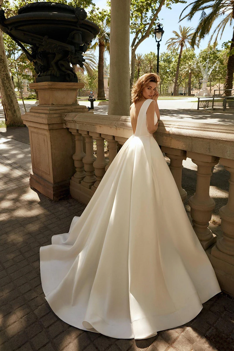 Платье Свадебное ТРАПЕЦИЕВИДНОЕ атласное с V-образным вырезом и отк...