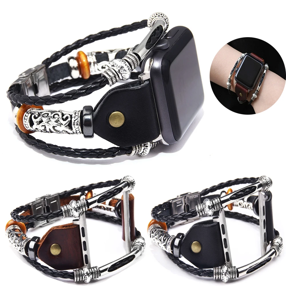 Ремешок из искусственной кожи для Apple Watch Series Band 5 4 3 2, серебристый плетеный браслет с бусинами для iWatch 42 мм 38 мм, 44 мм 40 мм