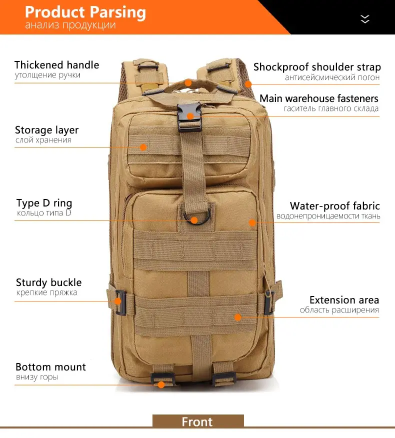 -Он изготовлен из ткани Оксфорд, высокой интенсивности и долговечности.-Вместительное основное отделение с застежкой-молнией вокруг, внутренний карман на молнии и сетчатый карман.-Специально разработанный наружный разделитель для ноутбука или планшетного ПК.-Передние отделения на молнии с мешочком на молнии.-Мягкие и регулируемые плечевые ремни, боковые компрессионные ремни.-Дышащая сетчатая подкладка для комфорта.-Регулируемый нагрудный ремень.-Молле крепления спереди и по бокам.-Аксессуары петли.