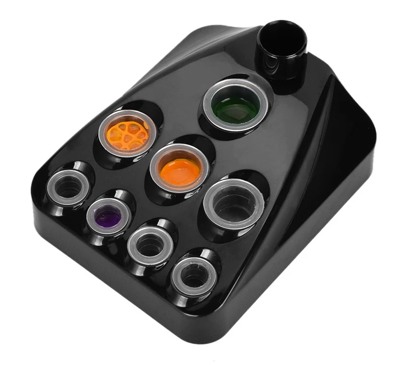 9 отверстий 2 в 1 пластиковый держатель для ручки для татуировки черный Характеристики: 1. Пластиковый материал, светильник. 2. Вы можете разместить на нем чернильные чашки и тампоны при работе с микропузырьками. 3. Удобно держать чернила для татуировок и предотвращать их выплескивание 4. 2 в 1, можно использовать не только для размещения чашки, но и для нанесения тату. 5. 9 отверстий, одно отверстие поддерживает тату-машину, одно отверстие большого размера, три отверстия среднего размера, четыре отверстия большого размера. 6. Держатель чашки чернил три размера, подходит для усиления тонер небольшого и среднего размера Материал: пластик Черный colorSize: приблизительно 8,5*6*2 см Посылка включает в себя: 1 * держатель татуировки